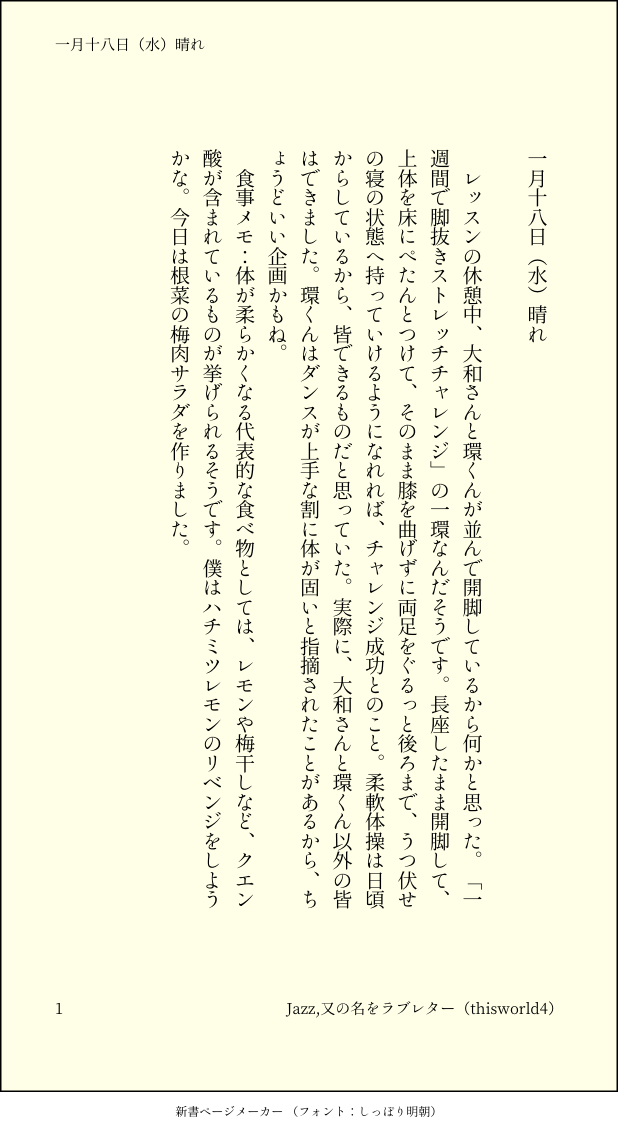 こうみ☆silencio seguirMEMORÁNDUMレッスンの休憩中、大和さんと環くんが並んで開脚しているから何かと思った。「一週間で脚抜きストレッチチャレンジ」の一環なんだそうです。 ##日記本 Toque para pantalla completa (tamaño:618x1132).Está prohibido volver a publicar ¡Mandemos reacciones! frecuenciapopularbocadillootrosProcesando pago Respuestas del creador ¡Sigue al creador que te importa!☆silencio seguir こうみHECHO死に方を決めること 4 こうみHECHOキャットウォークをつたう夜 8 こうみEnamoradoデートはひと月後の予定 3 こうみHECHO重ねた温度でうそを守って(環壮)5部配信分後の夜 3 こうみFeliz año nuevoステージの上で待ち合わせ(環壮) 3 こうみHECHOlifeis 露天風呂 2 obras recomendadas あさき🐙LUTOかなり前に描いた、ナチュラルに壁ドンしてるところ描きたかったんだけど背景どうしようってなって放置してるうちに忘れ去ってたオルサイを発掘したのでついでにポイポイしときますw壁ドン絵はまた改めて描きたいですね!! 10♦︎PASADOポケモン、ゼルダ。 3 夢想曲LUTOサークルカットでこの構図が結局ボツになったのでラフだけ描ききって供養。 こうみMEMORÁNDUM末年始は何かとバタつくので、四月始まりにしました。昨年こそきちんと日記をつけておけばよかった。 2 こうみMEMORÁNDUM未成年二人だから、あまりきわどいシーンはなかったです。それどころか、途中でうとうとしちゃってたもんね。 2 こうみMEMORÁNDUMこないだ環くんを起こしに部屋へ行ったら、上半身裸で、こないだあげた腹巻きだけしてた。 こうみMEMORÁNDUM僕は父の決めた大学の中から選んでしまったから、一織くんの相談にはあまり乗ってあげられないかも。 こうみMEMORÁNDUM環くんは正式には帰宅部という扱いだから、ほとんどの競技で得点王っぷりを見せつけてきたらしい。クラス対抗リレーなんか、アンカーで四人抜きだって。 2 こうみMEMORÁNDUM最近、油断してるとすぐ夜が明けると思ったら、もう夏至が近いんだ。僕はあまり夏の似合う男じゃないだろうけど、夏も好きだな。 2