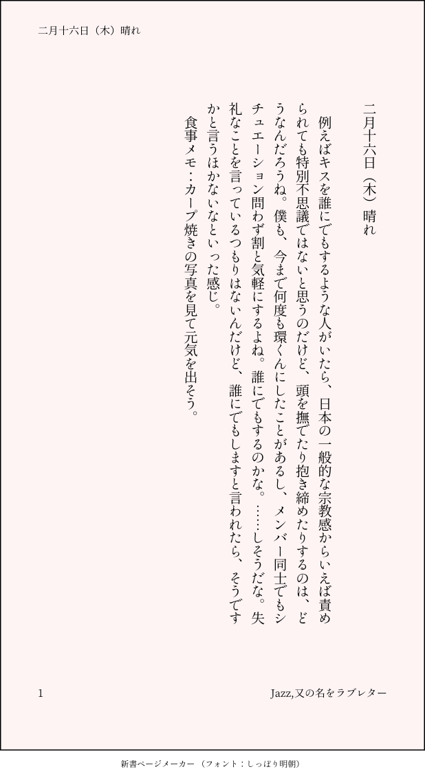 こうみ☆quiet followMEMO失礼なことを言っているつもりはないんだけど、誰にでもしますと言われたら、そうですかと言うほかないなといった感じ。 ##日記本 Tap to full screen (size:618x1132).Repost is prohibited Let's send reactions! freqpopularsnackothersPayment processing Replies from the creator Follow creator you care about!☆quiet follow こうみDONE死に方を決めること 4 こうみDONEキャットウォークをつたう夜 8 こうみValentineデートはひと月後の予定 3 こうみDONE重ねた温度でうそを守って(環壮)5部配信分後の夜 3 こうみHappy New Yearステージの上で待ち合わせ(環壮) 3 こうみDONElifeis 露天風呂 2