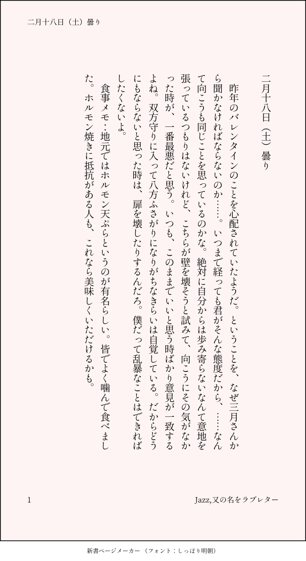 こうみ☆quiet followMEMO昨年のバレンタインのことを心配されていたようだ。ということを、なぜ三月さんから聞かなければならないのか……。 ##日記本 Tap to full screen (size:618x1132).Repost is prohibited Let's send reactions! freqpopularsnackothersPayment processing Replies from the creator Follow creator you care about!☆quiet follow こうみDONE死に方を決めること 4 こうみDONEキャットウォークをつたう夜 8 こうみValentineデートはひと月後の予定 3 こうみDONE重ねた温度でうそを守って(環壮)5部配信分後の夜 3 こうみHappy New Yearステージの上で待ち合わせ(環壮) 3 こうみDONElifeis 露天風呂 2 recommended works おはなちゃんDOODLE #fnaf #らくがき #供養 mogmogaskMOURNING供養 おちゃっぱ。MOURNINGガチャ引くの忘れた😂 こうみMEMOまだ急に冷え込むこともあるから出しておきたいけれど、暖かいと誰かさんが蹴っ飛ばして、かえって薄着になってしまうからなあ。 03atCELLDOODLEらくがき供養 こうみMEMO環くんは、ただの水だと減りが遅い。 こうみMEMO環くんが仕事前にくれたレモンキャンディ。口の中ですぐほろほろっと溶けた。 こうみMOURNING海に降る雪 こうみMEMOもうこれ以上、隠し事とまでは言わないまでも、言いにくいことを抱えたくないんだから、変なことはしないで……。