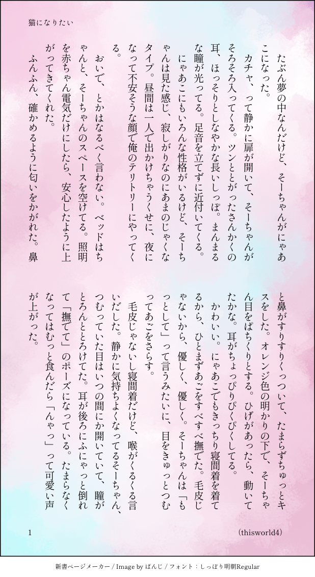 こうみ☆quiet followDONE猫になりたい ##小話 show all(+2 images) Tap to full screen (size:618x1132).Repost is prohibited Let's send reactions! freqpopularsnackothersPayment processing Replies from the creator Follow creator you care about!☆quiet follow こうみDONE死に方を決めること 4 こうみDONEキャットウォークをつたう夜 8 こうみValentineデートはひと月後の予定 3 こうみDONE重ねた温度でうそを守って(環壮)5部配信分後の夜 3 こうみHappy New Yearステージの上で待ち合わせ(環壮) 3 こうみDONElifeis 露天風呂 2 recommended works かいむMOURNING2014年頃、ポケアカで描きはじめた頃の絵 18 ⑅·*❁¨̮❁*·⑅MAIKINGカービィ落書き。アナログ描きかけからデジタル途中詰め3枚。よく分からないものが出来ました(汗)綺麗に描けなくて毎回挫折。デジ絵初心者の為エフェクト等素材が豊富すぎて全く使いこなせません(´;ω;`) 3 こうみMEMO『恋のかけら』っていうタイトル、結構恥ずかしいんじゃないかな……? こうみMEMO環くんは、明日の立ち位置はほぼずっと端だから目立たないだろうけれど、やっぱり隣の僕が一歩前に出て、動きを抑えたほうがいいのかな。 こうみMEMO一織くんは学校でいつも環くんと一緒にいるわけで、僕の知らない環くんのことも、たくさん見ているんだよね。 こうみMEMO環くんとの件を抱え込んでたせいだろうって、リーダーにはさすがに叱られました。マネージャーにも少し……。 2 こうみMEMO三者面談週間だそうです。出席番号順に行うものらしいけど、仕事のスケジュールの関係で、一織くんの次に環くんの順番を回してもらったらしい。社長が今後の進路の相談も兼ねて、二人ぶんのご挨拶に伺ったとのこと。 2 こうみMEMO春から主演を務めさせていただいていた『恋のかけら』のクライマックスが、ほぼ決まりました。やっぱり僕がフラれるようです。 2 こうみMEMO環くんはあれだけかっこいい体つきをしているのに、どうしてあんなに動物の耳が似合ってしまうんだろうね。