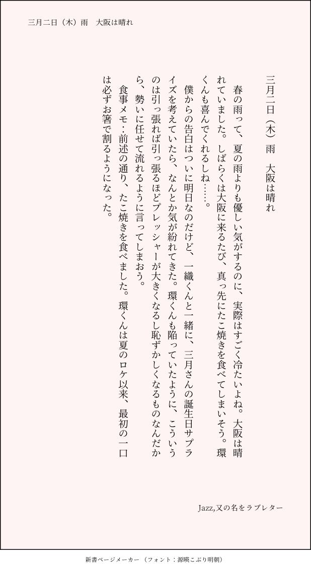 こうみ☆quiet followMEMO春の雨って、夏の雨よりも優しい気がするのに、実際はすごく冷たいよね。 ##日記本 Tap to full screen (size:618x1132).Repost is prohibited Let's send reactions! freqpopularsnackothersPayment processing Replies from the creator Follow creator you care about!☆quiet follow こうみDONE死に方を決めること 4 こうみDONEキャットウォークをつたう夜 8 こうみValentineデートはひと月後の予定 3 こうみDONE重ねた温度でうそを守って(環壮)5部配信分後の夜 3 こうみHappy New Yearステージの上で待ち合わせ(環壮) 3 こうみDONElifeis 露天風呂 2 recommended works gargantuapocketMOURNINGデータ整理中に発掘。物語の残骸的な。 5 こうみMEMOなんだか、MEZZO"が一足先にデビューした頃のことを思い出す。 2 こうみMEMO他のメンバーの前では大笑いしているところを初めて見た時、当時はあまり考えないようにしていたけど、やっぱりショックだったな……。 2 こうみMEMOまだ急に冷え込むこともあるから出しておきたいけれど、暖かいと誰かさんが蹴っ飛ばして、かえって薄着になってしまうからなあ。 こうみMEMO環くんは隠し事に気付いた上で、待ってるって決めてくれているのかもしれない。 こうみMEMOいつチャンスが来ても話せるようにしておこう。 こうみMEMO物理的な距離は遠くなっても、環くんは以前と変わらず、いや昨年よりずっと、僕の不調に敏感になってる。 こうみMEMO公式を丸暗記しろというのがそもそも酷か。とはいえ公式の解説をしているといつの間にか寝られる。 こうみMEMO「そーちゃん落っこちるから」って、せっかく手前側に寝てくれたのに、寝相が悪くてどんどん真ん中に行っちゃってる。