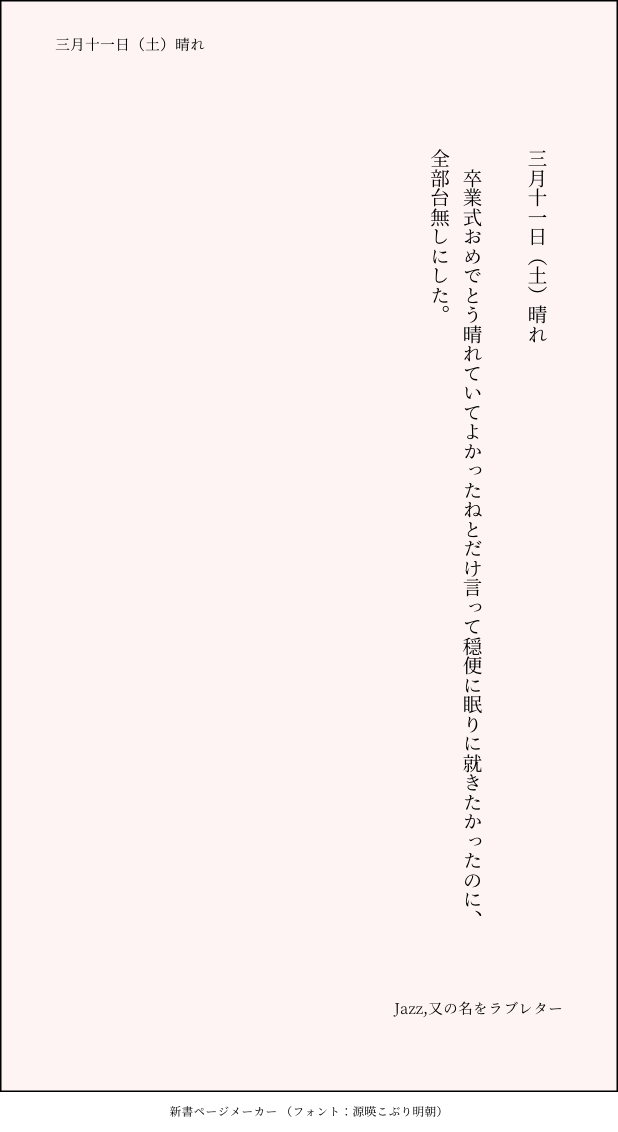 こうみ☆quiet followMEMO卒業式おめでとう晴れていてよかったねとだけ言って穏便に眠りに就きたかったのに、全部台無しにした。 ##日記本 Tap to full screen (size:618x1132).Repost is prohibited Let's send reactions! freqpopularsnackothersPayment processing Replies from the creator Follow creator you care about!☆quiet follow こうみDONE死に方を決めること 4 こうみDONEキャットウォークをつたう夜 8 こうみValentineデートはひと月後の予定 3 こうみDONE重ねた温度でうそを守って(環壮)5部配信分後の夜 3 こうみHappy New Yearステージの上で待ち合わせ(環壮) 3 こうみDONElifeis 露天風呂 2 recommended works 1315CAN’T MAKE反転したら地獄だった 遥海描 三郷MOURNING比叡発見記念に。おかえりなさい、比叡。 こうみMEMO父親に似ていくのかも、って気にするのなら、なおさら楽しいお酒を教えてあげたいな。 2 こうみMEMO一織くんと学力テストの勉強をするって言うから、ホットミルクだけ差し入れて出てきてしまった。 03atCELLDOODLEらくがき供養 こうみMEMOとにかく、次のオフの日に話すことに決めた。話したいことがある、ってちゃんと伝えた。 こうみMEMO少しでも笑えたほうがいいだろうからって、大和さんと三月さんが、量販店でメイク道具を買ってきた。不安だ。 こうみMEMOさて、期末テストの科目を見直してみたけれど、現代文はおおむね大丈夫だね。古典は鉛筆を転がして運が良ければというところだね。数学はいずれもダメです。 2 こうみMEMO環くんは、国語はたぶん得意なのに、僕の話が下手なんだろうか……物事を一つ伝えるのに時間がかかりすぎて、環くんが余計に疲れてしまう。