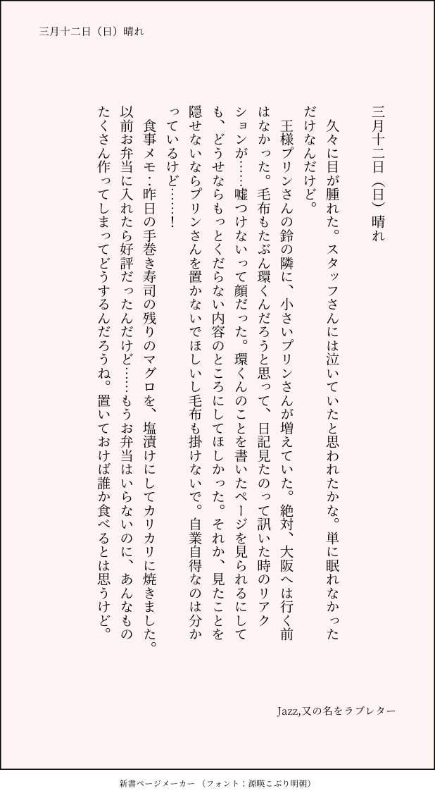 こうみ☆yên lặng theo dõiBẢN GHI NHỚ久々に目が腫れた。スタッフさんには泣いていたと思われたかな。単に眠れなかっただけなんだけど。 ##日記本 Nhấn để toàn màn hình(kích thước: 618 x 1132).Đăng lại bị cấm Hãy gửi phản ứng! freqphổ biếnsnackkhácXử lý thanh toán Câu trả lời từ người sáng tạo Hãy theo dõi!☆yên lặng theo dõi こうみLÀM XONG死に方を決めること 4 こうみLÀM XONGキャットウォークをつたう夜 8 こうみlễ tình nhânデートはひと月後の予定 3 こうみLÀM XONG重ねた温度でうそを守って(環壮)5部配信分後の夜 3 こうみChúc mừng năm mớiステージの上で待ち合わせ(環壮) 3 こうみLÀM XONGlifeis 露天風呂 2 công việc được đề xuất 1315KHÔNG THỂ LÀM ĐƯỢC反転したら地獄だった りず / ゆあQUÁ KHỨジャンルごちゃまぜ。むかしニコ生主だった頃にやったお絵かきクイズで描いた絵の一部。絵を描いて、リスナーさんにお題を当ててもらうという形式で描いたので、正解が早く出たものはすっごい中途半端です。全部で400枚やりました……ログ見てたら懐かしくなったのでぽいっと。 85 かいむTANG CHẾ2014年頃、ポケアカで描きはじめた頃の絵 18 こうみBẢN GHI NHỚ人の健康を心配している場合ではない……? こうみBẢN GHI NHỚ少しでも笑えたほうがいいだろうからって、大和さんと三月さんが、量販店でメイク道具を買ってきた。不安だ。 こうみBẢN GHI NHỚ環くんはあれだけかっこいい体つきをしているのに、どうしてあんなに動物の耳が似合ってしまうんだろうね。 こうみBẢN GHI NHỚ今年は青がベースカラーなんだね。「赤似合わないからこっちのがいい」って言ってたけど、去年のサンタ衣装もちゃんと似合ってたよ。 こうみBẢN GHI NHỚいつから置いてあったのかな……。くれるのかな。……そんなことあるかな。 こうみBẢN GHI NHỚ何も変わらなかったから、今日もいつも通りの二人です。なんだか自分の新たな弱点が分かっちゃったな。