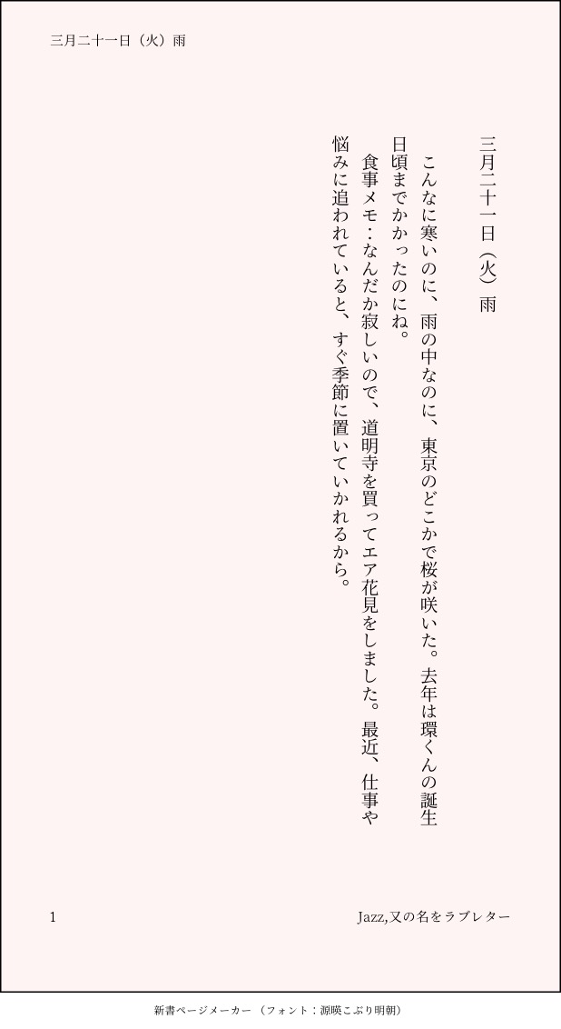 こうみ☆quiet followMEMOこんなに寒いのに、雨の中なのに、東京のどこかで桜が咲いた。 ##日記本 Tap to full screen (size:618x1132).Repost is prohibited Let's send reactions! freqpopularsnackothersPayment processing Replies from the creator Follow creator you care about!☆quiet follow こうみDONE死に方を決めること 4 こうみDONEキャットウォークをつたう夜 8 こうみValentineデートはひと月後の予定 3 こうみDONE重ねた温度でうそを守って(環壮)5部配信分後の夜 3 こうみHappy New Yearステージの上で待ち合わせ(環壮) 3 こうみDONElifeis 露天風呂 2 recommended works gargantuapocketMOURNINGどんだけいじくっても気に入らないからここで終了 Ochora_choDOODLE体育祭シーズンに描いてたやつを今更…笑私の母校の伝統になってた女子のタイヤ奪いです。当時、普段大人しい2人が熱い戦いしてたので進撃の最強女子2人に再現してもらいました👏 こうみMEMO一織くんは……いつも通りに見えたけど、十代の子たちにしか分からない何かがあるのかな。 こうみMEMO環くんには、僕には分からないような僕の気持ちも、分かってしまうのかな……。 こうみMEMOスマホのフォトフォルダに、環くんの写真がやたらといっぱい入っているんだけど。 こうみMEMO少しでも笑えたほうがいいだろうからって、大和さんと三月さんが、量販店でメイク道具を買ってきた。不安だ。 こうみMEMO確かに僕こそ睡眠時間の管理が甘いかもしれないけれど、一夜漬けまではしてない。 こうみMOURNINGそーちゃんは、フツーは触んないようなとこばっかりビンカンだ。 こうみMEMOそんな君が好きだったんです。 2