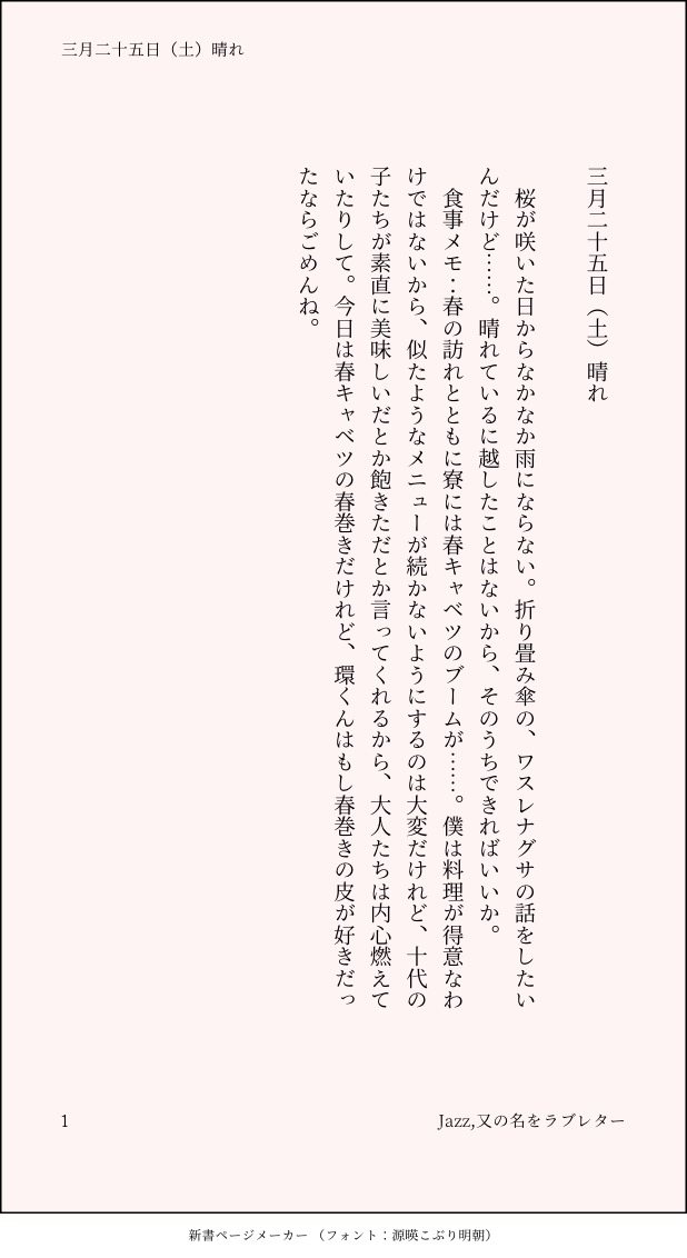 こうみ☆quiet followMEMO桜が咲いた日からなかなか雨にならない。折り畳み傘の、ワスレナグサの話をしたいんだけど……。 ##日記本 Tap to full screen (size:618x1132).Repost is prohibited Let's send reactions! freqpopularsnackothersPayment processing Replies from the creator Follow creator you care about!☆quiet follow こうみDONE死に方を決めること 4 こうみDONEキャットウォークをつたう夜 8 こうみValentineデートはひと月後の予定 3 こうみDONE重ねた温度でうそを守って(環壮)5部配信分後の夜 3 こうみHappy New Yearステージの上で待ち合わせ(環壮) 3 こうみDONElifeis 露天風呂 2 recommended works Capricorn_nkMOURNING真っ青な我が師も捨てがたかった gargantuapocketMOURNINGどんだけいじくっても気に入らないからここで終了 こうみMEMO失礼を承知で、環くんの進路について、社長に伺いに上がりました。ごめんなさい。結論からいうと、環くんはアイドルを本業にすることを考えているそうだった。 2 こうみMEMO環くんの考えは、僕とは少し違うかもしれないな。どんなにここにいてほしくたって、時にはきっと手を離す。自分のわがままを押し付けたりしない。 2 こうみMEMO環くんは、ケーキの上を宝石箱にしてしまうモンスター……だったんだけど、ブルーベリークリームの上にグミの夕陽を浮かべたり、アラザンの花道でナッツたちを踊らせたり、金平糖でプラネタリウムを作ったり、途中から趣旨が変わっていたような。 2 こうみMEMO一織くんが模試代や受験料のために節約しているのを見て、環くんが時々お菓子付きのおもちゃをおごってあげたりしている。 こうみMEMOささいなことでも口に出して褒めると、必ず嬉しそうな顔をしてくれていたのに……これじゃあどうコミュニケーションを取ったらいいのか分からない。 2 こうみMEMOいつから置いてあったのかな……。くれるのかな。……そんなことあるかな。 こうみMEMO君だけは特別だとか例外だとか言って適当にあしらってしまえたらよかった。
