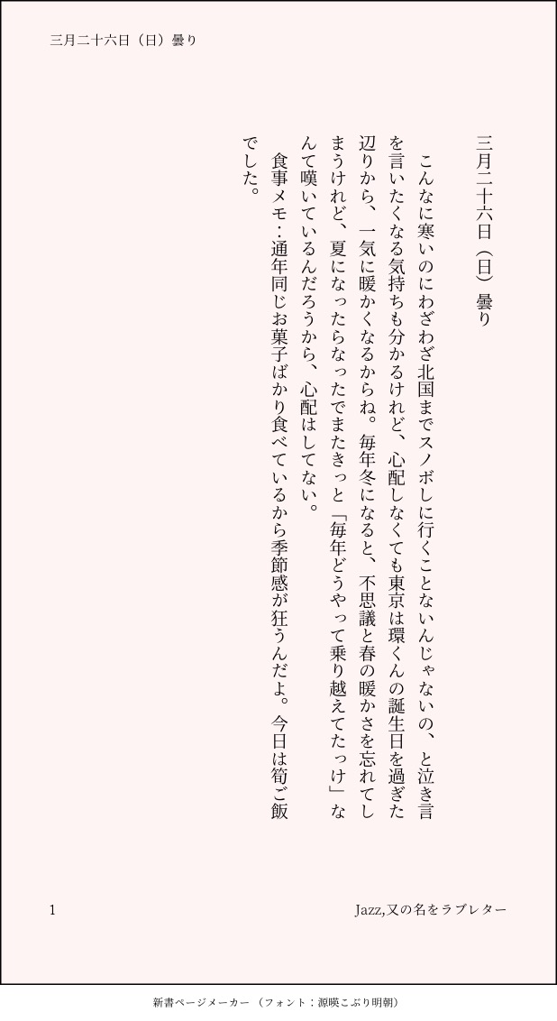 こうみ☆quiet followMEMOこんなに寒いのにわざわざ北国までスノボしに行くことないんじゃないの、と泣き言を言いたくなる気持ちも分かるけれど、心配しなくても東京は環くんの誕生日を過ぎた辺りから、一気に暖かくなるからね。 ##日記本 Tap to full screen (size:618x1132).Repost is prohibited Let's send reactions! freqpopularsnackothersPayment processing Replies from the creator Follow creator you care about!☆quiet follow こうみDONE死に方を決めること 4 こうみDONEキャットウォークをつたう夜 8 こうみValentineデートはひと月後の予定 3 こうみDONE重ねた温度でうそを守って(環壮)5部配信分後の夜 3 こうみHappy New Yearステージの上で待ち合わせ(環壮) 3 こうみDONElifeis 露天風呂 2 recommended works ちぇりあMOURNINGアナログ線画お絵描き(2枚目は色塗りしようと思って力尽きたやつ) 3 みちゅちゅMOURNINGうまくかけなかった…べーしてる椋くん描きたかった ORE_NO_IMOURNINGこないなと思ってたらガチャ来た こうみMEMO話す前に、知られてしまった。 2 こうみMEMO環くんは正式には帰宅部という扱いだから、ほとんどの競技で得点王っぷりを見せつけてきたらしい。クラス対抗リレーなんか、アンカーで四人抜きだって。 2 こうみMEMO僕と環くん……MEZZO"の仕事じゃなくても、よく目を合わせるようになったね。 こうみMEMO少しでも笑えたほうがいいだろうからって、大和さんと三月さんが、量販店でメイク道具を買ってきた。不安だ。 taaaaaadanoMOURNINGアイコン用に影をつけた雉くん こうみMOURNING遊覧船