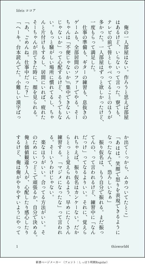 こうみ☆quiet followDONElifeis ココア ##lifeis show all(+1 images) Tap to full screen (size:618x1132).Repost is prohibited Let's send reactions! freqpopularsnackothersPayment processing Replies from the creator Follow creator you care about!☆quiet follow こうみDONE死に方を決めること 4 こうみDONEキャットウォークをつたう夜 8 こうみValentineデートはひと月後の予定 3 こうみDONE重ねた温度でうそを守って(環壮)5部配信分後の夜 3 こうみHappy New Yearステージの上で待ち合わせ(環壮) 3 こうみDONElifeis 露天風呂 2 recommended works おはなちゃんDOODLE #fnaf #らくがき #供養 こうみMEMO未成年二人だから、あまりきわどいシーンはなかったです。それどころか、途中でうとうとしちゃってたもんね。 2 こうみMEMO隠すつもりはないんだけど。周りの意見を聞いた上で、ちゃんと時間を取って、座って話したくて……。 こうみMEMOいつチャンスが来ても話せるようにしておこう。 こうみMEMO最近、油断してるとすぐ夜が明けると思ったら、もう夏至が近いんだ。僕はあまり夏の似合う男じゃないだろうけど、夏も好きだな。 2 こうみMEMO僕だって大好きな人とずっと一緒にいられたならなんて幸せだろうって、思わないわけじゃない。 2 こうみMEMOお化け屋敷のロケで泣き腫らして帰ってきた後なのに、環くんは居間で中間テストの勉強をしています。 こうみMEMOそーちゃんもこんなだったの、と訊かれたけど、どうだったかな。忘れちゃった、と正直に答えたら、また悲しそうな顔をされた。せっかくおしゃべりできたのにな。 でんなつMOURNINGフォルダにあった今までに塗った絵の線画とか下描きとか描いた時期もジャンルもしっちゃかめっちゃかやな! 17