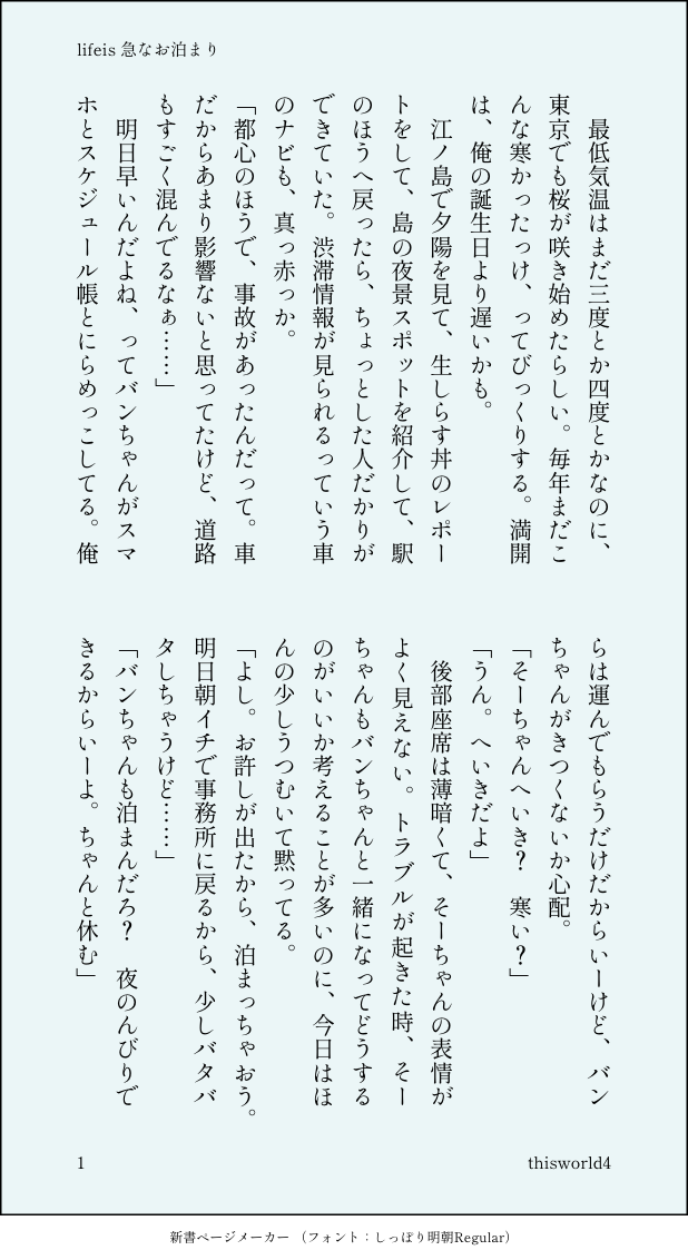 こうみ☆quiet followDONElifeis 急なお泊まり ##lifeis show all(+1 images) Tap to full screen (size:618x1132).Repost is prohibited Let's send reactions! freqpopularsnackothersPayment processing Replies from the creator Follow creator you care about!☆quiet follow こうみDONE死に方を決めること 4 こうみDONEキャットウォークをつたう夜 8 こうみValentineデートはひと月後の予定 3 こうみDONE重ねた温度でうそを守って(環壮)5部配信分後の夜 3 こうみHappy New Yearステージの上で待ち合わせ(環壮) 3 こうみDONElifeis 露天風呂 2 recommended works こうみMEMO食べ物がたくさん出てくる撮影だったからかな、環くんが終始子犬みたいな眼をしてた。 2 こうみMEMO環くんに道端で眠り込まれても、僕は背負って帰るのは無理だろうな。事務所の車かタクシーを呼ぶことになるのか……? こうみMEMOグラビアの撮影中、環くんがやたら僕を後ろ向きにさせるなと思ったら、隈がひどいんだ。 こうみMEMO今度はなくさないでくれるといいな。 こうみMEMO春から主演を務めさせていただいていた『恋のかけら』のクライマックスが、ほぼ決まりました。やっぱり僕がフラれるようです。 2 こうみMEMO僕には少し甘すぎたけれど……と思っていたのがバレたのかな。移動中に、環くんが唐辛子せんべいをくれた。 フジタロスDOODLEコハクちゃん😘加工前の こうみMEMO苦労することがいいことだと言うつもりはないけれど、自分たちのビジョンの無さは、いつか命取りになるんじゃないだろうか。 2 こうみMEMO僕は、どんなに環くんを大事に思っていても、いつか「幸せになって」と言って、環くんから離れていくんだって。