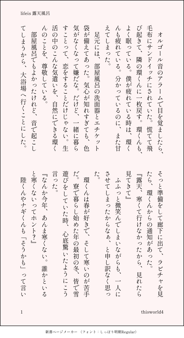 こうみ☆quiet followDONElifeis 露天風呂 ##lifeis show all(+1 images) Tap to full screen (size:618x1132).Repost is prohibited Let's send reactions! freqpopularsnackothersPayment processing Replies from the creator Follow creator you care about!☆quiet follow こうみDONE死に方を決めること 4 こうみDONEキャットウォークをつたう夜 8 こうみValentineデートはひと月後の予定 3 こうみDONE重ねた温度でうそを守って(環壮)5部配信分後の夜 3 こうみHappy New Yearステージの上で待ち合わせ(環壮) 3 こうみDONElifeis 露天風呂 2 recommended works gargantuapocketMOURNINGどう頑張っても思った模様が出なくってボツ こうみMEMO一織くんは……いつも通りに見えたけど、十代の子たちにしか分からない何かがあるのかな。 こうみMEMO二人して、生物の資料集を読みふけってしまった。順位制とか、生存曲線とか、文系選択の授業では触れずに卒業してしまったコラム記事がたくさん載っていて、つい時間を忘れた。 2 こうみMEMOいっそ追試を早朝にしてもらうとか……? こうみMEMO二年生が今、修学旅行に行っているらしい。いいなって思っただけ、って言っていたけど、去年環くんと一織くんは、仕事の関係で途中までしか参加できなかったから、心残りなんだと思う。 2 こうみMEMOお化け屋敷のロケで泣き腫らして帰ってきた後なのに、環くんは居間で中間テストの勉強をしています。 こうみMEMO本当は、大好きな人を置いていく男を演じることも、少し怖いんだよ。 2 こうみMEMO優しさを知るたび好きになって、それで一緒にいたいと願うなんて、……まるで、誰にも優しくできないほど寂しかった頃の君を、どこかに置いていくような気分だった。 2 こうみMEMOすぐそばにいるはずなのに遠いのと、今みたいに物理的に離れているのとでは、やっぱり前者のほうが強烈に寂しさを感じるものなのかな。 2