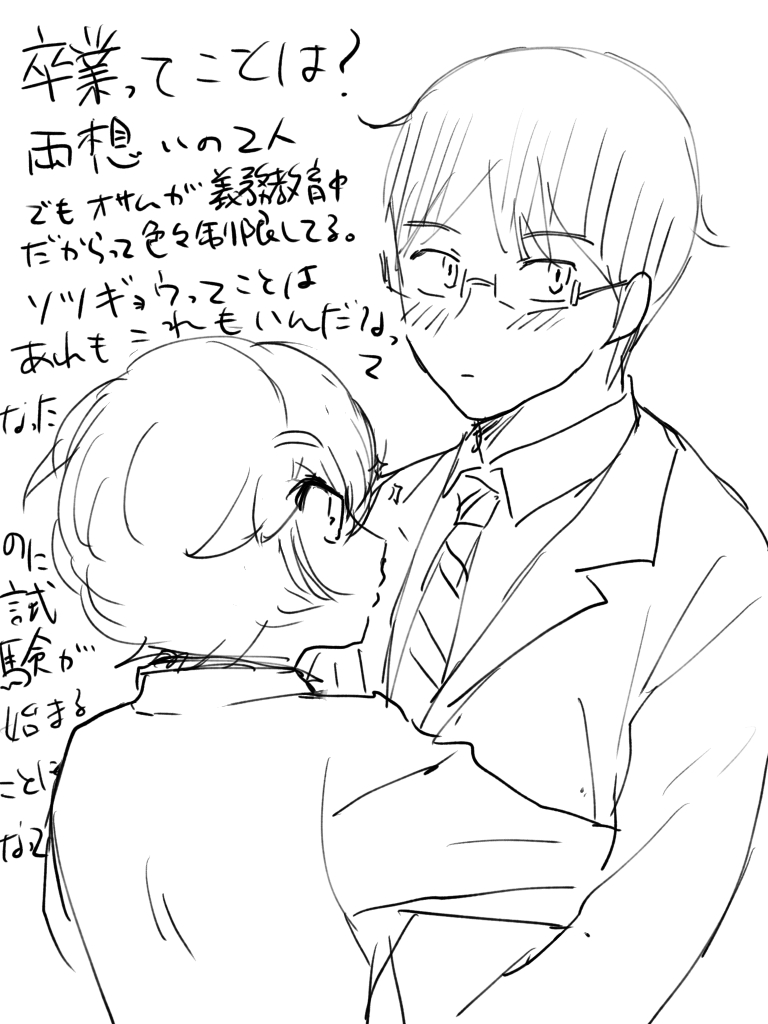 卒業→試験で盛り上がってる!これはもう両思いの遊修なんですが、ギムきょーいく中だからって、あれもこれも許してくれないオサ。ユマは両思いなら色色したいけどオサの気持ちも尊重したくて我慢だったのが、卒業ってことはいいんだな?ってワクワクしてたのに、遠征試験の閉鎖環境で離れ離れ決定して……時系列まとめてくれてるの見たら、1日2日ありそう。妄想広がる