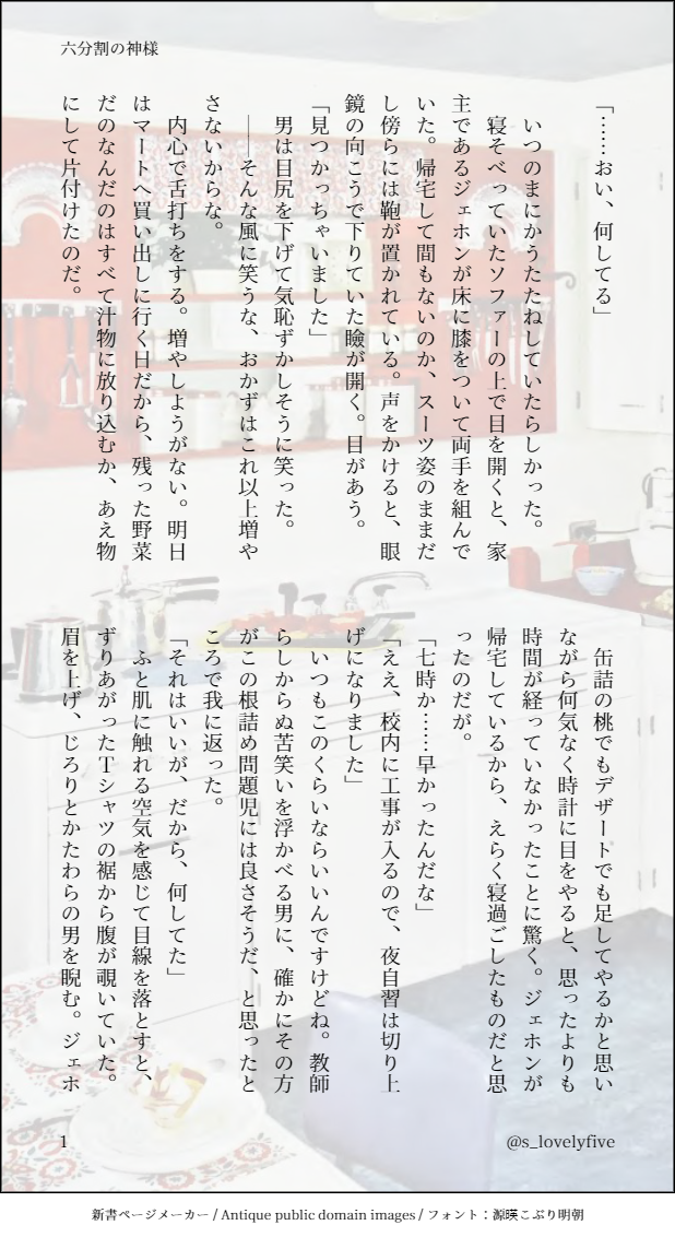 s_lovelyfive☆quiet followDONE面倒見のいいサンウクさんとお疲れでちょっとふわふわしてるジェホン先生。健全。同棲してます。コメディのはずがすべりました。あれぇ… #ジェホン jephon #サンウク #サンジェホ sanjiehoe. #ジェホサン jehosan. show all(+4 images) Tap to full screen (size:618x1132).Repost is prohibited Let's send reactions! freqpopularsnackothersPayment processing Replies from the creator Follow creator you care about!☆quiet follow s_lovelyfiveDONE【Candy in my ears《私の耳にキャンディ》】・ゴスレ原作軸、現代転生グレフロ二次創作・うっすら性的な描写、表面上同意が曖昧と感じるかもしれないシーンあり注意グレイの髪のSSを書こうとしただけだったはずなのに、ちょっと筆がすべりまして、フローが楚々とした姿の内に抱えているモノ、のしっとり甘々ネタになりましたR15くらいです原作のじわじわ不穏な魅力あるフロー目指して挫折(反省 12 s_lovelyfiveDONE⭐️渋に加筆修正版Up済です弱る攻めを癒す受けシリーズ(?)、キンxポーシュです。悪夢(?)とご奉仕。NC未遂です(時間が...)ずっと書きたかった主人公CP。誕生日記念に書き始めたのがこうなりました。おかしなところがあるかもしれませんがご容赦ください🙏(前作までの感想ありがとうございます😭)(何か有ればリプもしくは絵文字で応援するの横の吹き出しをご利用下さい👍) 18 s_lovelyfiveREHABILI※渋に加筆修正版うpベガスの独白。ピート拘束〜最終話本家抗争辺りの、ベガスの心情の変化を解釈してみようと足掻いてみました。ベガスがピートと出会えて良かったと思います。まだまだペガピ掴み切れなくて試行錯誤しているので、コメント頂けたら泣いて喜びます☺️よろしくお願いします🙏(絵文字で応援する、の横の吹き出し使えます。リプでもOKです🙆♀️)※ちょこっと修正しました 9 s_lovelyfiveREHABILIリハビリその③-念のためR18(NC未遂です)。本編後三人で暮らしているベガスピート(+マカウ)。カップルなので色んなものが駄々洩れになっています。ベガピむずかしい…ピートこんなんいうかな…と随分悩んだのですが、口調かわいいピートが見たくて書きました。ふわっとした感じでお読み頂けると幸いです。もしコメントなどありましたら、リプや吹き出しマークからどうぞ。 14 s_lovelyfiveREHABILI落ち込む時があるベガスを愛して支えて甘やかすピートの話。KinnPorscheを完走して、メインの二人はもちろんのことベガピの相互救済CP具合にどうしようもなくハマってしまい、ひとりで文章のリハビリをしていた結果の産物です。回想NCシーンあり。弱る攻めを可愛がるタフな受けが好きなので、そういう方向性です。色々おかしなところや矛盾点などあるかもしれませんが、大目にみて頂けたら幸いです。 8 s_lovelyfiveDONE今年のはじめの猫の日にツイッターに進行しながら投稿していたAU小説をレスキューして少しだけ文章を足しました。あたらしくSHに入居された方のおやつになれば。左右どちらでもお好きなほうで!ジェホン先生とサンウクさんが一緒にいてほしいだけのおたくより。 14 related works 蜂須賀DONESweetHome ジェホサン居酒屋さんうくちん。ショートショートショート。サンウクちん、オシャレなカフェの店員さんのあの長い腰下のエプロンしてるイメージ(オシャレなカフェというダサワードこのさんうくちんの淹れるコーヒーは果たして美味いのか?? 1101 蜂須賀DOODLEわくちん昨日打ったらお熱が出て、今日ワッキー雑誌が届いて、バーテンさんも出てきて頭バーンてなったので書きました。全部副反応です。ごめんなさい。ジェホサンです!エロくないけど!? 3802 蜂須賀DOODLESweetHome ジェホサン告ってもないふたりのショートショートショート。ふたりの乗るエレベーターには誰か駆け込んで来がち。スンワンさんグッジョブ的な?7/16えっちパート追記しました! 3318 00HHMMDOODLE8.1話のサンウクさん妄想 3418 HXcztmDONE先生は舌ぺろが絶対似合う s_lovelyfiveDONE面倒見のいいサンウクさんとお疲れでちょっとふわふわしてるジェホン先生。健全。同棲してます。コメディのはずがすべりました。あれぇ… 5 s_lovelyfiveDONEややサンジェホ寄りの先生とヤクザさん。温泉っていいですよね、とお話していたら衝動に駆られました。(ただしプロローグが本題)(力尽きた模様)tonさんありがとうございます。 7 HXcztmDONEハイツおからさんのテイラー先生オマージュです!なむひ氏のあのスーツたまらんでしたね… s_lovelyfiveDONEヤクザの金庫番と二課の刑事のふしぎな関係。ややジェホサン寄り?(性描写なし)ジェホ>>>>>>サンというかんじ(執着...)猫の日創作が何故かこうなりました!いつもありがとうございます! 9 recommended works HXcztmDONEよっぱらい先生描きたいだけ。もっとふにゃふにゃの先生が見たい! おやまだINFO2/27開催のオンラインイベントに参加予定します。E館:こ4ジェホサンでの参加となります☺️画像は表紙になる予定のものです。すきだねこの構図(すきです) HXcztmDONEだいぶ手癖が出て参りました もう似せるのは諦めたんや… HXcztmDONE描