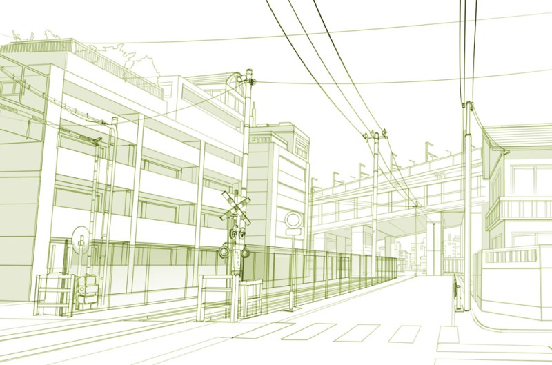どこかのマンションを模写です、手前の踏切は廃線になり撤去されました、さみしい。