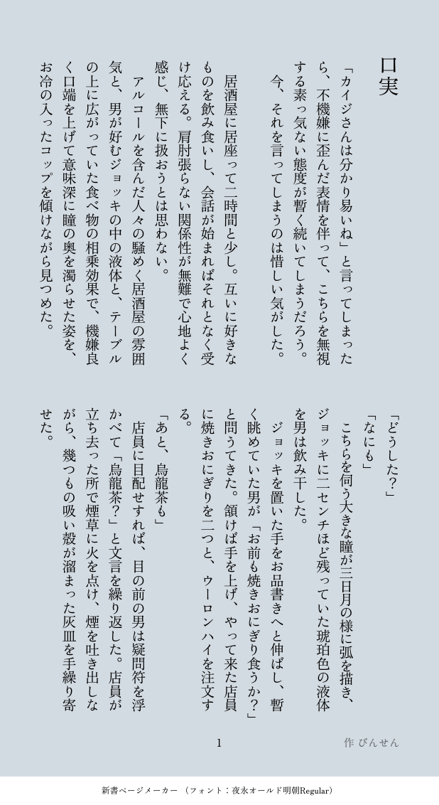びんせん☆quiet followMOURNINGアカカイ飲みに行ったらスイッチの入った話し show all(+4 images) Tap to full screen (size:618x1132).Repost is prohibited Let's send reactions! freqpopularsnackothersPayment processing Replies from the creator Follow creator you care about!☆quiet follow びんせんMOURNINGアカカイ+モブビジネスホテル清掃員モブ視点の話し 4 びんせんMOURNINGアカカイ飲みに行ったらスイッチの入った話し 5 びんせんMOURNINGアカカイで、初めてえっちした後に再会した話し。初めてアカカイを書いたけど、こんなもの許されるのでしょうか…? 7 びんせんMOURNING神カイでお酒を飲んだ話し 2 びんせんMOURNINGモブ→→→カイ(神カイ)のお話し。恋に盲目なモブ、魅力的 10 びんせんMOURNING神カイのお話し。酒とタクシーと男二人 6 recommended works ノウァDOODLEマルコ&エースわしゃわしゃマルコともぐもぐエースが見たかったので生産。笑顔のマルコって破壊力えぐい…ヒィヒィ ましろTRAINING4部まで読了しました!ハンティング回の甥っ子と叔父さんが可愛かったです2人とも美人すぎて私の画力では無理だ……ジョジョ絵描ける方本当に尊敬します………… えだまめDOODLEカーズ様は綺麗なお姉さんだと思っている(? tonami6851PAST初めて描いたミスタ YoshiameDOODLE落書き数枚 4 tamaPASTDIOヴァニ てんは天ぷらが好きDOODLEhttps://twitter.com/ten_dondondon/status/1229284160025444352?s=19 戻りガツオDONEトリッシュお誕生日絵 ( ᐛ )TRAINING2020年7月20日お肉の理解まであと∞日