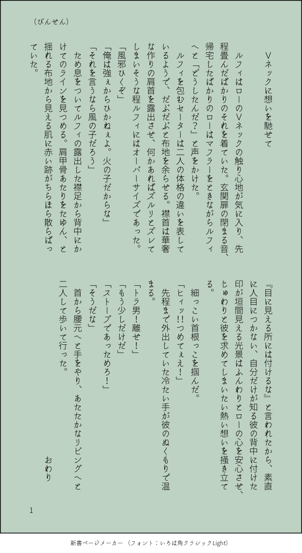 びんせん☆quiet followMOURNINGワンピロールローのVネックに想いを馳せて #ワンピ wampee Tap to full screen (size:618x1132).Repost is prohibited Let's send reactions! freqpopularsnackothersPayment processing Replies from the creator Follow creator you care about!☆quiet follow びんせんMOURNING神カイのお話し。酒とタクシーと男二人 6 びんせんMOURNINGほんのり神カイの超SS。眠たいネ申域 2 びんせんMOURNINGメモの中に埋もれていたシャンルの、少しえっちちな超SSを供養します。pass:あなたは18歳以上ですか?→半角英数字 634 びんせんMOURNINGほんのり神カイ?🎲君と煙草と父親 3 びんせんMOURNINGほんのり神カイ?1999.09.26に思い馳せ 5 びんせんPROGRESSオメガバ神カイの書きかけとっても書きかけ 8 related works むにおDOODLEわんぴまとめ 6 ノウァDOODLEローとコラさんフニャっと笑うコラさんかわいい…ローもかわいい… 4 ノウァDOODLEロー&コラさんローおめでとう~ギリギリまにあった…?プレゼントはコラさんカスタムのくまぬいとかだといいなw るんこPROGRESS終わんねーな!!!!!! ノウァDOODLEコラさん(アオハル風)きっと彼は高3。ローは高1かな。 ノウァDOODLEロー&コラさん※二枚目ゴマフアザラシロー 3 ノウァDOODLEコラさん&ローIF生存の旅行中設定wメイクしてないコラさんもちびローは見てたと思うんですよ…コラさんがママすぎる…無理…(著しく語彙力を失う) 3 ノウァDOODLEロー&コラさん久々落書き。自分から沼に近づいてしまった気がするアアアア 2 にくみそまきPAST🥗混じってます 9