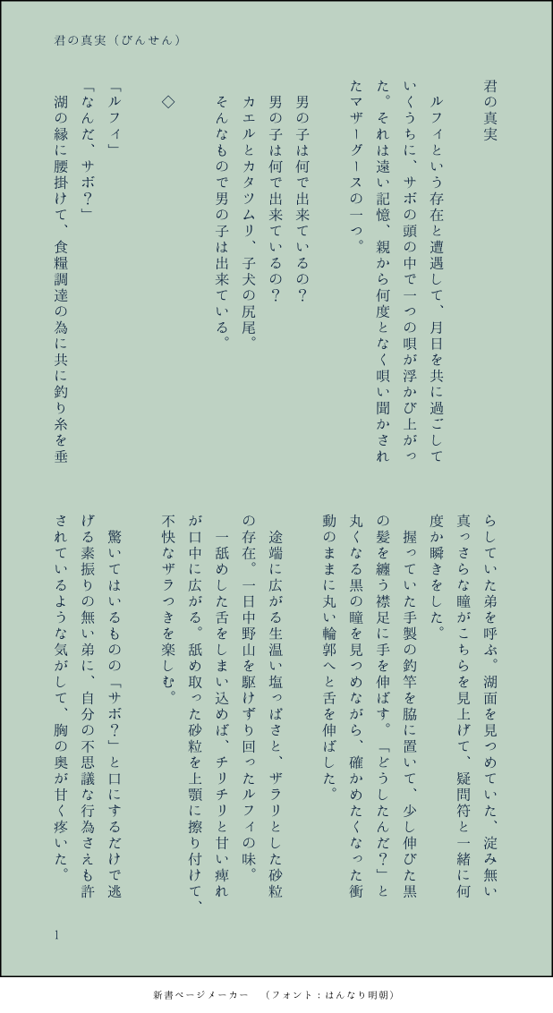 びんせん☆quiet followMOURNING幼い頃のサボル『マザーグースを学んでいたサボ君』という存在に想いを馳せて。 #ワンピ wampee show all(+1 images) Tap to full screen (size:618x1132).Repost is prohibited Let's send reactions! freqpopularsnackothersPayment processing Replies from the creator Follow creator you care about!☆quiet follow びんせんMOURNING神カイのお話し。酒とタクシーと男二人 6 びんせんMOURNINGほんのり神カイの超SS。眠たいネ申域 2 びんせんMOURNINGメモの中に埋もれていたシャンルの、少しえっちちな超SSを供養します。pass:あなたは18歳以上ですか?→半角英数字 634 びんせんMOURNINGほんのり神カイ?🎲君と煙草と父親 3 びんせんMOURNINGほんのり神カイ?1999.09.26に思い馳せ 5 びんせんPROGRESSオメガバ神カイの書きかけとっても書きかけ 8 related works ノウァDOODLEロー&コラさん※二枚目ゴマフアザラシロー 3 にくみそまきPAST🥗混じってます 9 ノウァDOODLEコラさん&ローIF生存の旅行中設定wメイクしてないコラさんもちびローは見てたと思うんですよ…コラさんがママすぎる…無理…(著しく語彙力を失う) 3 ノウァDOODLEロー&コラさん久々落書き。自分から沼に近づいてしまった気がするアアアア 2 ノウァDOODLEローとコラさんフニャっと笑うコラさんかわいい…ローもかわいい… 4 むにおDOODLEわんぴまとめ 6 ノウァDOODLEコラさん(アオハル風)きっと彼は高3。ローは高1かな。 るんこPROGRESS終わんねーな!!!!!! ノウァDOODLEロー&コラさんローおめでとう~ギリギリまにあった…?プレゼントはコラさんカスタムのくまぬいとかだといいなw recommended works もぐもぐ/ぱんDOODLE荒木荘創作でこの二人がまとめられてるのかわいい。 花療りみDONEトリッシュ ynm2605MOURNING何もかも迷走してたときの絵 ましろTRAINING6部読了しました……………一週間近く放心状態だったのですが、やっとお絵描きできるくらいメンタルが回復してきました……イケメンヒーローな徐倫と最早ヒロインな承太郎さんにドキドキしたり、DIO様とプッチ神父のベッドシーン(語弊)に困惑したり、物凄い美女が登場したと思ったら男だったり(アナスイ)、辛かったけどやっぱり面白かったですみんな格好いいなー本当 a3_m100DOODLE構図わからない勉強したい てんは天ぷらが好きDOODLEhttps://twitter.com/ten_dondondon/status/1229284160025444352?s=19 さおりーぬDONEフゴたん 3 ひるのMAIKINGデザインとか能力が好きなスタンドを描きたくて…。 tamaPAST※クロスオーバーどこにも載せてなかったやつ。圧倒的美ジュアルコンビ推し