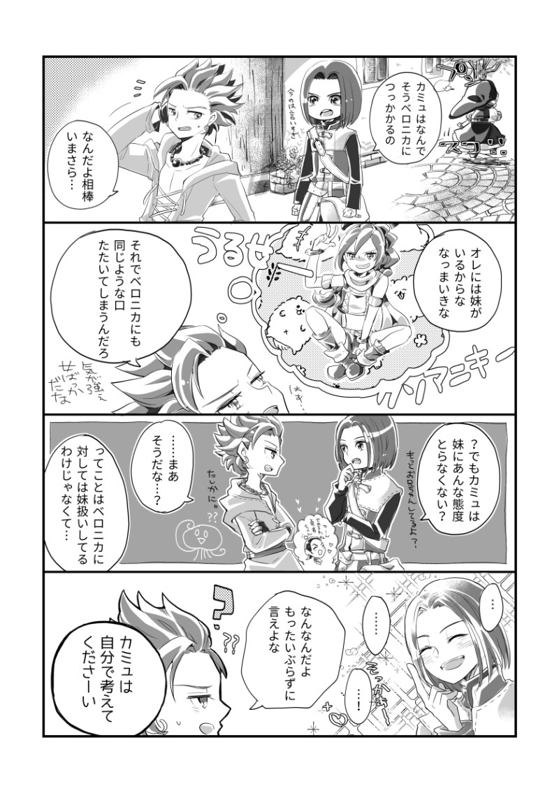 ゆずこまめ☆quiet followDONE3/6カミュベロの日おめでとうございます💙🥳🥳🥳❤️カミュベロwebオンリーイベント「オレの連れがなにか?」の展示物になります。カプ要素皆無ですいません11メンみんなすきすぎる ##カミュベロ show all(+1 images) Tap to full screen (size:839x1191).Repost is prohibited Let's send reactions! freqpopularsnackothersPayment processing Replies from the creator Follow creator you care about!☆quiet follow ゆずこまめMAIKING描きかけばかりたまっていく🙄描きたい絵も漫画ネタもあるのに完成させるまでの時間と根気が足りない…(主に後者) ゆずこまめMAIKINGセーニャを描くために資料開くたびに泣きそうになる………勇者を導くという使命感ははじめはセーニャからはあんまり感じられなかったけど、お姉さまの意志を継いでものすごくすさまじく辛いはずなのに悲しみに暮れずすぐに前を歩く成長の様子から愛の強さを感じてすきすきのすきです ゆずこまめMAIKING聖剣3もすきです!!!プレイする前はシャルロット身体は子供だけど年齢は大人(?)という情報だけ知ってたからベロニカちゃん???と思ってたけど全然違ってそれが良かった💓💓💓どちらもだいすきキャラです😌推しはデュラン👍👍👍 ゆずこまめDONE3/6カミュベロの日おめでとうございます💙🥳🥳🥳❤️カミュベロwebオンリーイベント「オレの連れがなにか?」の展示物になります。カプ要素皆無ですいません11メンみんなすきすぎる 2 ゆずこまめPROGRESS愛すべきにぎやかし隊 ゆずこまめPROGRESSweb展示用漫画の原稿中1P漫画つめのつもりだけど何枚描けるかな… recommended works 露海rororoPROGRESSとある設定をお借りしたカミュベロ漫画を描いてるんですが、カム君→ニカちゃんに恋するのはなんとなく分かるんですが、ニカちゃん→カム君への気持ちが、姉もしくは親目線から恋に発展するのはどんな時か考え中🤔やっぱり少年から男性への変化を感じた時かなぁ。加えていうと、カム君はニカちゃんがずっと小さいままだと、どう心と体の整理をつけるのか🤔こう言う話を誰かとしたいんだけど、ぼっちなんもんで🙃 3 露海rororoDOODLE支部に溜まってたイラスト等投稿しました。漫画描く息抜きで別の漫画描いて、そっちのが仕上がるの早いのなんでなんや…いつもこんな感じです。飽き性だからかな。背景とか描き慣れないキャラの服調べるのが面倒ξだな。話はさておき、我が家にもあつ森が。あたしはまだやってませんが、息子が嬉々としてやってます。虫がリアルでやる前からテンションだだ下がりなんですが…みんなポケ森忘れてるだろ ももとせDOODLEカミュベロ落書きマンガです!背景はログアウトしました…裏ネタバレ、軽い流血表現あり 最後は没コマ供養… 22 ももとせDONEカミュベロWEBオンリー、WEB公開漫画です。ラクガキクオリティですが、楽しんでいただけると嬉しいです!(両片思い前提) 8 露海rororoDONEそろそろ皆さんのお手元に本が届いてるみたいなので、本と一緒に入れたお礼メッセージ絵、おまけで付けた表紙没案(タイトルと合わんので)です。夢心地のような1日でした。沢山の方とお話しできて楽しいひと時でした。きっと一生忘れないです🙏本、ネップリ、アクスタもお買い上げありがとうございました🙏お話ししてくれた方、ボードに書き込みくれた方本当にありがとうございました🙏感謝して生きていきます😊 2 露海rororoDONE★前半が割と最低カミュなのでご注意下さい🙄今日はエイプリルフールです😌時渡してきたあたしなので今日はエイプリルフールです。誰がなんと言おうとエイプリルフールなのです。なにも考えずさらっと細かいこととか気にしないで読む系漫画しか描けまてんのでよろしくお願いします🙇♂️軽く2ページくらいで終わらせる予定の話が何でか無駄に9ページになっていた🤤 9 露海rororoDOODLE某カミュベロみたっぷりなシャンプー&コンディショナー概念カミュベロ好き勝手描いてます😇2枚目はベロニカの腹チラと、カミュのかわいい足上げ()出来なかったのでリベンジしたやつrkgkほんで、このニカちゃんの膝小僧をprprするカミュが生まれました(一つ前のやつ) 3 露海rororoMEMOついったのブクマ見返してたらテンプレ出てきたので、懐かしい話でやってみました😇元々考えてた話があったんですが、ワンドロを描くにあたって描き直しました。後その片鱗をのぞかせるネーム2枚次はネップリ漫画のやつとか、王子様のキス〜のやつもやりたい🤤 3 露海rororoDOODLE久々テンプレお借りしました😚このある時ない時は過去にそのつもりで描いたのがあって、肝心のオチをペン入れしていないという(◯51の豚まんネタ)以下再掲してます☺️カミュはニカちゃん居ないと普通に過ごしてるんだけど、どこかつまんねえーって気分で生きてると思います(not表エンド)あたしの描くカミュはやさぐれます😇 6