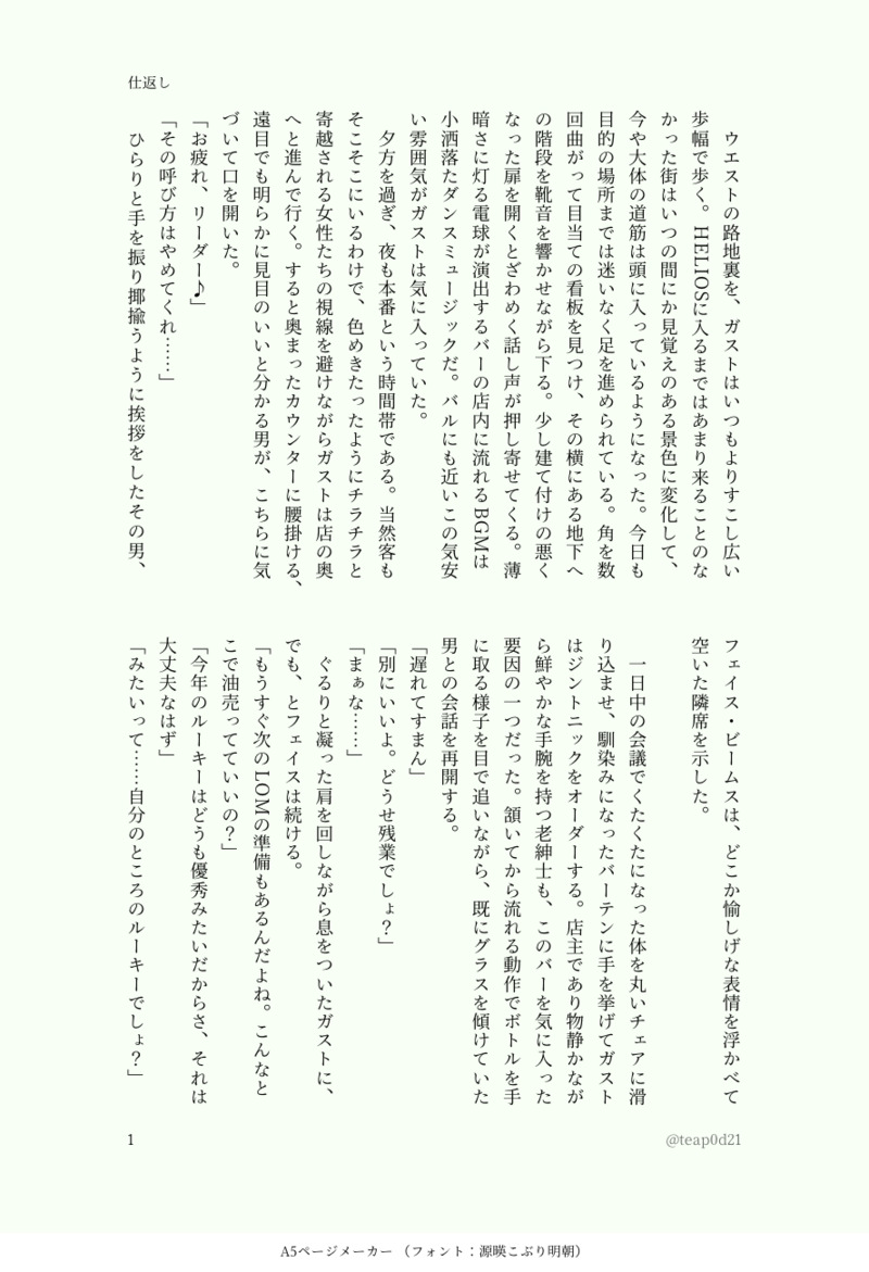 茶子@展示置き場☆quiet followDONE🍃❄️ DMH3 新作②メンターリーダーをやってるガストの話。顔面ツートップしかいません。大きく関連あるわけではないですが、Pixiv掲載「不意打ち」と同軸です。PW:オンリー会場のお品書きに記載 #ガスレン gasDrainage show all(+6 images) Tap to full screen (size:888x1300).Repost is prohibited Let's send reactions! freqpopularsnackothersPayment processing Replies from the creator Follow creator you care about!☆quiet follow 茶子@展示置き場DONE🧪🌹 再掲ほぼ+寄りのブロマンス具合。無自覚がたびたび周囲に誤解を与えていそうな二人。 3 茶子@展示置き場DONE🎧🎸再掲①2021ハロウィン当日ホームボイスより。 4 茶子@展示置き場DONE🍃❄️再掲①全員が20歳を迎えたB班が飲みに行く話。 3 茶子@展示置き場DONE🍃❄️DMH3 新作①付き合って間もない頃の、同室日常話。 4 茶子@展示置き場DONE🍃❄️ DMH3 新作②メンターリーダーをやってるガストの話。顔面ツートップしかいません。大きく関連あるわけではないですが、Pixiv掲載「不意打ち」と同軸です。PW:オンリー会場のお品書きに記載 7 茶子@展示置き場DONE🍃❄️ 風猫2 新作ガストが妬く話。 3 related works なつきDOODLE❄️のやらしいおかおが見たい えんじゅDOODLE出来心 mirrormahouDONEI did it, i finished a fic!! this was my first GastRen fic so it might be a ooc for some.. but i can asure you that i kept rereading stories to make sure it's not ooc and enjoyable i read!! 7809 madono_uraDOODLE 7 なつきDOODLE🌪❄️ namida_tmrnjigaDOODLEガスレン…風味の…レンです。バランス崩してベットに押し倒しちゃっだけどまんざらでも無さそうだよ⁉️みたいなやつ…ガスが手だけだし切れてるので申し訳ない 2 なつきDOODLE🌪❄️ちゅっちゅ namida_tmrnjigaDOODLEすごいテキトーなガスレン ※本当にすごいテキトー 後で修正、追加すかも namida_tmrnjigaDOODLEなんかレンがめっちゃ乗り気なガスレン ※IQ2 recommended works ElMilaW73_esDOODLEフェイジュニキスの日一応日本語に訳しますが、何が間違ったらすみませんでした、直してくれるなら感謝します 2 ElMilaW73_esPASTキミショコ既存の作品展示用フェイジュニ【Live2D 展示】◆ URL:http://topcd.no-ip.org:8154/fjonly0626/------------------------------------- 39 aymPROGRESS先週のフェイジュニワンドロの線画 たまには載せてみます れいとDONE220212 Rockなキミにショコラを添えて2・ネットワークプリントパスワードは【Aエリアい5ー脳みその缶詰】の品書きに記載しています※追記:パスワード解除しました ElMilaW73_esPROGRESS【新刊サンプル展示】キミに一番近い特等席で36P / A5 / R18 / フェイジュニGuest : 上さん(@UE_9999)◆ 3月中旬完成予定です~ 10 れいとPROGRESS遅刻したジュニア誕の落書きというかラフ、いつか仕上げられるといいね彼氏が後ろにいるから気持ちはフェイジュニ!! nishimuku3611DOODLE意地が悪かったり隙をうかがったり到底ロマンチックなキスにはならないふたりがかわいい 4 shippo_esPASTワンドロお題【風邪】です 4 muniko_495DONE🐞 四肢欠損