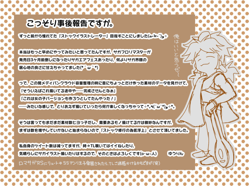 ゆうりん 普段はサガシリーズのイラストを描いてますが、他ジャンルのイラストや完成させる気力が足りず、埋もれかけのサガイラストを載せていこうと思います。 ☆quiet follow Yell with Emoji POIPOI 26