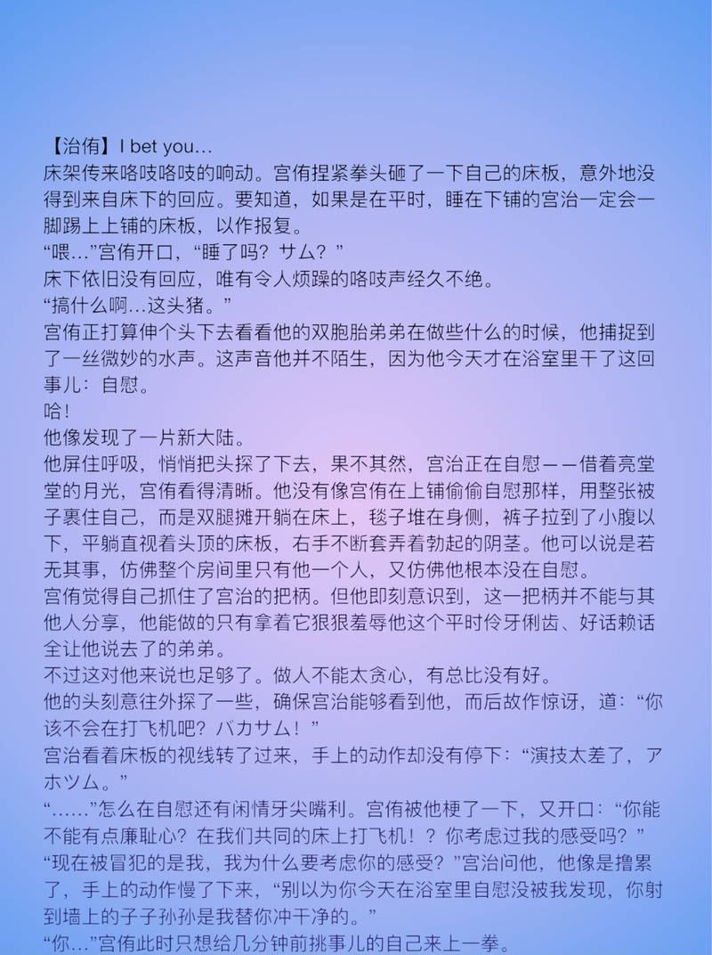 Frieddddchicken☆quiet followDONE【治侑】I bet you…*dk治侑*r向*有自慰被发现的内容*ooc*共7k字+ show all(+8 images) Tap to full screen (size:1411x1891).Repost is prohibited Let's send reactions! freqpopularsnackothersPayment processing Replies from the creator Follow creator you care about!☆quiet follow FrieddddchickenDONE【及岩】密友*同居背景下的上班族及岩*有r18*极度ooc*1.4w字+ 10 FrieddddchickenDONE【治侑】I bet you…*dk治侑*r向*有自慰被发现的内容*ooc*共7k字+ 9 FrieddddchickenDOODLE【五悠】Long Way Home*好心的便车司机五(31岁)x离家出走的高中生虎(18岁)*伪公路文学*R18*ooc*一个tips:因为日本是右舵车,所以文中的驾驶室在右边,而不是左边 47 FrieddddchickenDOODLE【甚虎】泥泞*杀手甚x高中生虎*伏黑甚尔第二人称视角*R18g*囚禁,有dirty talk、掐人致死行为(未死),可能引起不适,请谨慎点入*ooc*1.2w+字Summary:你叫伏黑甚尔,你接下了绑架虎杖悠仁的悬赏,由于你的雇主方临时出现变故,委托终止,你借此机会将虎杖悠仁囚禁在了你的家中。 34 FrieddddchickenMEMO一点提问箱的回答 具体请看图 8 FrieddddchickenBLANK【夏虎】春汛*养子夏(18)x养父虎(26)*存在自慰情节*存在孤儿院经历叙述(我乱写的,被trigger到了的话我道歉!!)*夏父母双亡*共1.7w字*oocSummary:由于大学时到孤儿院做义工,虎杖悠仁在那里认识了双亲去世的夏油杰,并在日后收养了他。 12