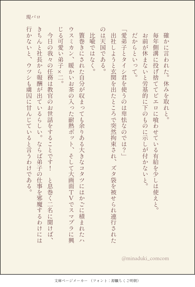 minaduki_comcom☆quiet followPAST現パロカムラ興業のssほぼ主任です ##カムラ興業 show all(+5 images) Tap to full screen (size:630x928).Repost is prohibited Let's send reactions! freqpopularsnackothersPayment processing Replies from the creator Follow creator you care about!☆quiet follow minaduki_comcomMAIKINGウ虐の話の別視点。♂弟子(notBL)です。様子のおかしい教官注意。続きます。 1207 minaduki_comcomSPOILERタイトルアップデート5弾の所感です4/20 22:00 追記4/21 03:00 追記 1529 minaduki_comcomMAIKINGご注意:B級ホラーを目指して頑張って書いた程度のグロ描写があります通称:ウ虐(出来なかった)話まだ続きます4/29 500文字ほど追加 1550 minaduki_comcomDONE初めてのせくはらにショックを隠せない箱入りマイハン(15)という話。ハンターの名前ありますウツハン♀です 7 minaduki_comcomDONE主任がアップを始めたので万事大丈夫!趣味に走りすぎてない?という現パロカムラ興業の深掘りです注:ウハ♀は無いよ 2119 minaduki_comcomDONE現パロ 犬の教官が愛弟子と出会うまで 4003