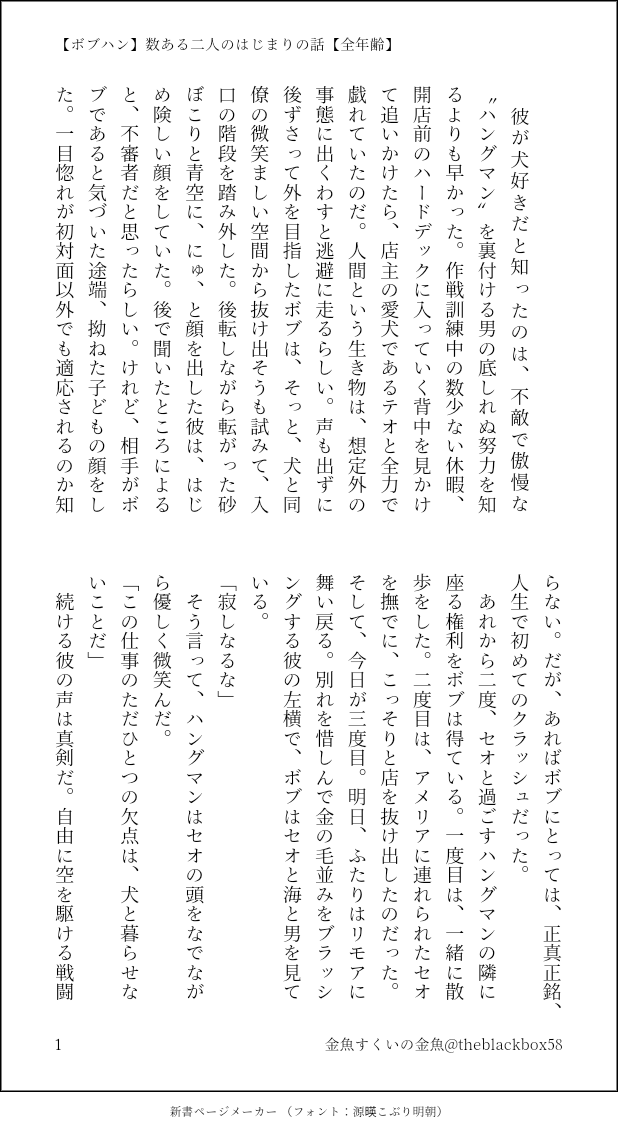 theblackbox58☆quiet followDOODLE【ボブハン】数ある二人のはじまりの話【全年齢】犬とボブハン、いっぱいよみたいのきもち #ボブハン bobbedHair show all(+3 images) Tap to full screen (size:618x1132).Repost is prohibited Let's send reactions! freqpopularsnackothersPayment processing Replies from the creator Follow creator you care about!☆quiet follow theblackbox58DONE【ルスハン】きみがため【全年齢】ハッピーバレンタイン!ルスタのために苦手なお菓子作りに挑戦するハンのはなしです。うちのルスハンは、ルス料理上手、ハン合理性重視がデフォパスワードは英字小文字三文字です 7 theblackbox58PAST【ルスハン】薔薇を一本【全年齢】2023/02/14エックス上げの再掲ですハッピー♡バレンタイン基地内で追いかけっこするルスハンルス→→→(←←)←ハンがすきなんですよねパスワードは小文字で英字三文字です 3 theblackbox58DOODLE【ボブハン】杞憂【全年齢】ボブの愛が減っているのでは?!と危機感を覚えるハンの話。ハンがでろでろ。パスワードは英字三文字です 5 theblackbox58PAST【マクダノ】12月26日【全年齢】Xあげ再掲。できてないふたりの過去と今。ラストシーズンの内容が含まれます。パスワードは英字三文字 3 theblackbox58PAST【ボブハン】酔いにでまかせ【全年齢】Xあげ再掲。お題使用です。ハングマンはボブとお酒を飲むのが好き。「お酒を飲んで赤くなった君と見つめ合うと、なんだか素敵な勘違いができそうだから」#shindanmakershindanmaker.com/687098パスワードは英字三文字です 4 theblackbox58PAST【マヴェ←ハン】ひとおもいにどうぞ【全年齢】Xあげ再掲。ハッピーハロウィンするマヴとマヴにでろでろなハンがどうしてもよみたくて。この狼さんは、落ちそうだから落としてみよっかな、くらいのノリだとおもいます。パスワードは英字三文字 3 related works ゆうとDONEオメガバ的なボブハン👓🥴 3 deracine74Reuse HalloweenHappy Halloween 🎃インキュバス🥴💕ハングマン神父👓ボブ注意*体毛多しパスワード:いつもの英語3文字●●●+数字3つ●●● Peridod_yellowDONE《Just a ----》という題名でボブハンのSSを3つ書きました。3~4PのみR18です。コピー本を作るためにこしらえたのでどれも短めですが個人的にはかなりお気に入りです。そのうちしっかり書くのも楽しいかなって思ってます。まぁ緩くお楽しみください。よしなに。🗝 Under18?+「ベイビーオンボード」の略称は?+優秀な彼が好きな曲は?(基本的に全て大文字) 6 vvsm52DONEボブハンエッチなやつセックスしかしていない ※ボブが殆ど眼鏡してません18↑? yes or no 5036 kairohiyoriariDONEボブハン140字SS(随時追加予定)お題は診断メーカーより 18 ゆうとDOODLEボブハン👓🥴また🍌の話してるけど、攻の🍌が大きい話はなんぼしてもいいですからね theblackbox58PAST【ボブハン】酔いにでまかせ【全年齢】Xあげ再掲。お題使用です。ハングマンはボブとお酒を飲むのが好き。「お酒を飲んで赤くなった君と見つめ合うと、なんだか素敵な勘違いができそうだから」#shindanmakershindanmaker.com/687098パスワードは英字三文字です 4 Hatchimaru_DONE【R18】ちんぐり返しでセルフ顔射状態になっているハンを描きました!いちおうボブハンです。リクエスト下さった方ありがとうございました〜見てくださるといいな…。パスはアルファベット3文字 theblackbox58DOODLEワンライ、遅刻失礼します!お題は、鏡と微笑み、どちらも使用させていただきました。剃毛ネタですのでご注意ください。さらっと剃毛させてますが、この🥴は見た目の美しさと蒸れたときの不快感がいやで、常にぱいぱんを心がけている🥴です今回は👓がお手伝いしました🪒 2 recommended works 永@haaru523DONE【耀玲】「赤に溶ける」"どこまでも"耀玲のお話は「知らない場所のはずなのに、どこか懐かしい気がして立ち止まる」で始まり「黙って頷いたその瞳があんまり優しくて泣いてしまった」で終わります。#こんなお話いかがですかshindanmaker.com/804548 3 かほる(輝海)DONEシティーハンター冴羽獠×槇村香原作以上の関係かほるさんちの獠と香ちゃんで「港」と「記念日」のお話はどうでしょう? 8ツイート(1120字)以上だと嬉しいですっ!#shindanmaker #CHしたったーhttps://shindanmaker.com/965157過去作を少し手直ししただけ😂 3 かほる(輝海)DONEシティーハンター冴羽獠×槇村香原作以上の関係あなたはかほるさんちのRKで【可愛い声が聴きたい / 軽蔑】をお題にして140字SSを書いてください。#shindanmakerhttps://shindanmaker.com/780366惚れた女を自分の手で啼かせてるからねぇ…(*´ω`*) 148 aosabikinakoDONE #富豪プラス #BULプラス かとはる夢へのお題は『誰のものだとお思いで?』です。#shindanmakerhttps://shindanmaker.com/392860 SasameDONEもくり内お題創作2つ目です。あなたはあなたのところのRKで【はじめてだった / ひとりでしてたの?】をお題にして140字SSを書いてください。#shindanmakerシュガボ捏造。文字数オーバー 572 はるしきDONEフウモクのお話は「花なんか別に好きじゃなかった」で始まり「さあ、どうだったかな」という台詞で終わります。#shindanmaker #こんなお話いかが