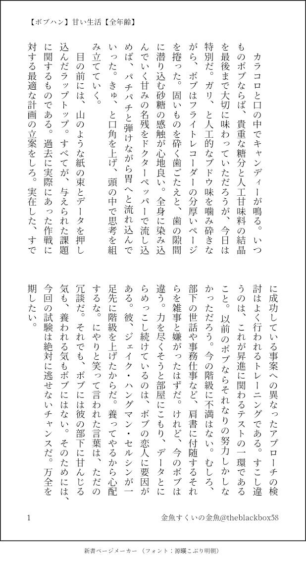 theblackbox58☆quiet followTRAINING気がつけば一ヶ月強何も書いてなかったので練習です。かわいいよボブハン、かわいいよ。わたしはとくに試験勉強等してません。そして、昇進試験の内容等々は完全なる妄想です!!知識ゼロの感覚で書いてます!! #ボブハン bobbedHair show all(+3 images) Tap to full screen (size:618x1132).Repost is prohibited Let's send reactions! freqpopularsnackothersPayment processing Replies from the creator Follow creator you care about!☆quiet follow theblackbox58DONE【ルスハン】きみがため【全年齢】ハッピーバレンタイン!ルスタのために苦手なお菓子作りに挑戦するハンのはなしです。うちのルスハンは、ルス料理上手、ハン合理性重視がデフォパスワードは英字小文字三文字です 7 theblackbox58PAST【ルスハン】薔薇を一本【全年齢】2023/02/14エックス上げの再掲ですハッピー♡バレンタイン基地内で追いかけっこするルスハンルス→→→(←←)←ハンがすきなんですよねパスワードは小文字で英字三文字です 3 theblackbox58DOODLE【ボブハン】杞憂【全年齢】ボブの愛が減っているのでは?!と危機感を覚えるハンの話。ハンがでろでろ。パスワードは英字三文字です 5 theblackbox58PAST【マクダノ】12月26日【全年齢】Xあげ再掲。できてないふたりの過去と今。ラストシーズンの内容が含まれます。パスワードは英字三文字 3 theblackbox58PAST【ボブハン】酔いにでまかせ【全年齢】Xあげ再掲。お題使用です。ハングマンはボブとお酒を飲むのが好き。「お酒を飲んで赤くなった君と見つめ合うと、なんだか素敵な勘違いができそうだから」#shindanmakershindanmaker.com/687098パスワードは英字三文字です 4 theblackbox58PAST【マヴェ←ハン】ひとおもいにどうぞ【全年齢】Xあげ再掲。ハッピーハロウィンするマヴとマヴにでろでろなハンがどうしてもよみたくて。この狼さんは、落ちそうだから落としてみよっかな、くらいのノリだとおもいます。パスワードは英字三文字 3 related works Hatchimaru_DONE【R18】ちんぐり返しでセルフ顔射状態になっているハンを描きました!いちおうボブハンです。リクエスト下さった方ありがとうございました〜見てくださるといいな…。パスはアルファベット3文字 ゆうとDOODLEボブハン👓🥴また🍌の話してるけど、攻の🍌が大きい話はなんぼしてもいいですからね deracine74Reuse HalloweenHappy Halloween 🎃インキュバス🥴💕ハングマン神父👓ボブ注意*体毛多しパスワード:いつもの英語3文字●●●+数字3つ●●● ゆうとDONEオメガバ的なボブハン👓🥴 3 Peridod_yellowDONE《Just a ----》という題名でボブハンのSSを3つ書きました。3~4PのみR18です。コピー本を作るためにこしらえたのでどれも短めですが個人的にはかなりお気に入りです。そのうちしっかり書くのも楽しいかなって思ってます。まぁ緩くお楽しみください。よしなに。🗝 Under18?+「ベイビーオンボード」の略称は?+優秀な彼が好きな曲は?(基本的に全て大文字) 6 vvsm52DONEボブハンエッチなやつセックスしかしていない ※ボブが殆ど眼鏡してません18↑? yes or no 5036 kairohiyoriariDONEボブハン140字SS(随時追加予定)お題は診断メーカーより 18 theblackbox58PAST【ボブハン】酔いにでまかせ【全年齢】Xあげ再掲。お題使用です。ハングマンはボブとお酒を飲むのが好き。「お酒を飲んで赤くなった君と見つめ合うと、なんだか素敵な勘違いができそうだから」#shindanmakershindanmaker.com/687098パスワードは英字三文字です 4 theblackbox58DOODLEワンライ、遅刻失礼します!お題は、鏡と微笑み、どちらも使用させていただきました。剃毛ネタですのでご注意ください。さらっと剃毛させてますが、この🥴は見た目の美しさと蒸れたときの不快感がいやで、常にぱいぱんを心がけている🥴です今回は👓がお手伝いしました🪒 2 recommended works mikasoPAST氷室辰也さんがサンタさんから貰えるプレゼントは「彼氏」です#今年あなたがサンタさんから貰えるもの #shindanmakerhttps://t.co/svdQZsIpH2と診断結果が出てきたのでつい描きました。自分が氷紫スキ―(紫氷も好き)なので陽泉Wエが多いです。5枚目の元ネタはすみっコぐらしの特大ぬいぐるみが元ネタですw 8 こよみTRAININGあなたはこよみんちの獠香で【試してる? / 鏡ごしに目が合う】をお題にして140字SSを書いてください。#shindanmakerhttps://shindanmaker.com/780366「ちょいエロシチュ」のお題なのだが、ちょいエロの数歩前の話になってしまった。しかも、なんか、テーマ(お題)がぼやけてる😅精進します! SasameREHABILI細雪んとこの獠ちん香にゃんで「最初に好きになったのは」と「かすめる」のお話はどうでしょう? 4ツイート(560字)以下だと嬉しいですっ!#CHしたったー #shindanmakerhttps://t.co/ou3tHwUc49香にゃん!いいのか!?ホントにその男でいいのか!??www 2 いちず🍊DOODLEあなたはコビナミの「とっくに気付いてるくせに」という台詞を使った1コマ漫画を描きます。#この台詞を使って1コマ漫画 #shindanmakerhttps://shindanmaker.com/524501フィルターの練習しようと思って色こねくり回してた。ラフを線画にしていないしレイヤー1枚に色を塗った色