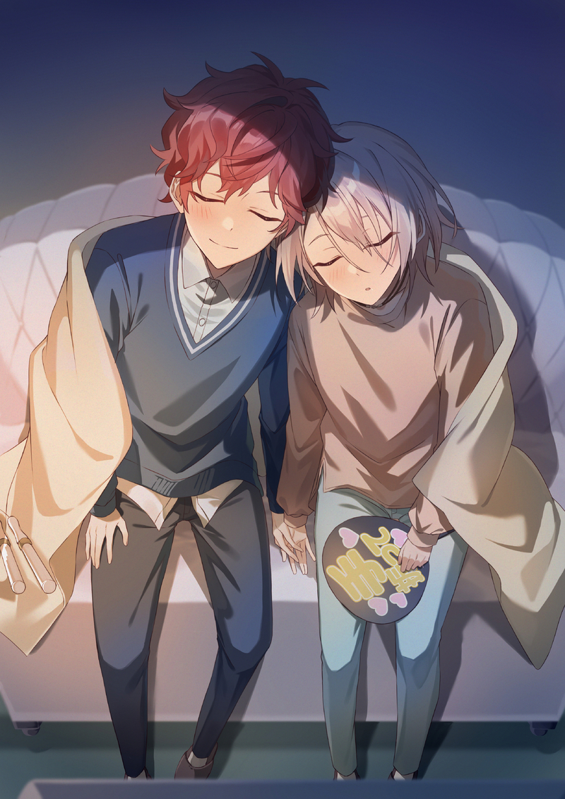 一緒にライブ映像観ていたら藍良くんが眠っちゃったので肩枕してあげている一彩くんと一彩くんの肩に寄り掛かっている藍良くんです。