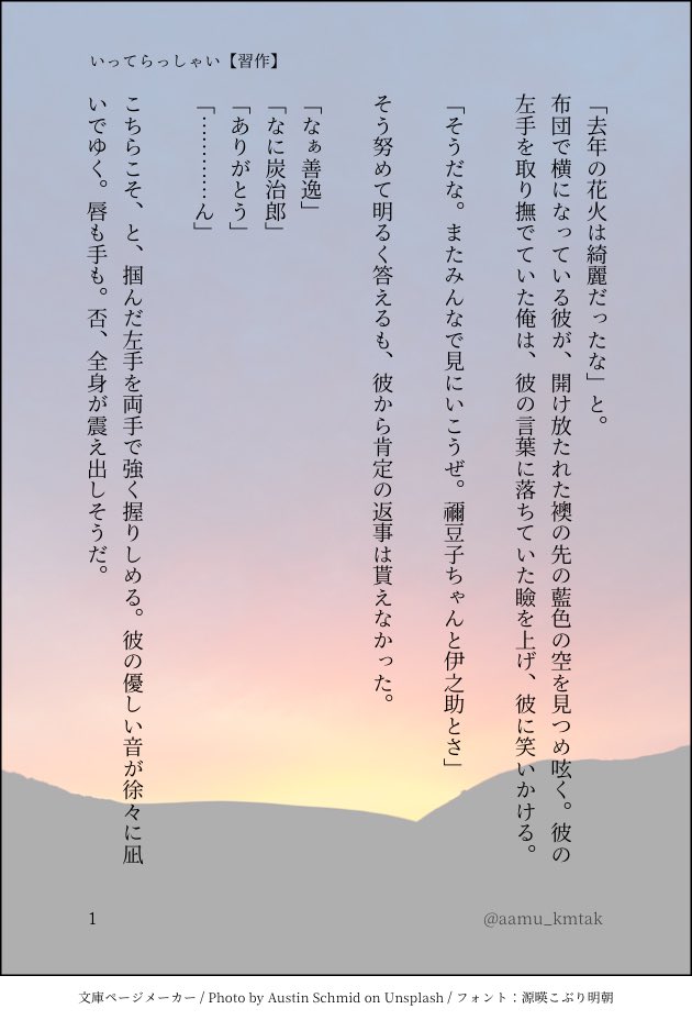 あぁむ☆quiet followMOURNING炭善。⚠️タヒネタ。診断メーカーより、『「去年の花火は綺麗だった」で始まり、「ほら、朝が来たよ」で終わる物語を書く。できれば3ツイート(420字)以内でお願いします。』を書きました。30字オーバー。 show all(+1 images) Tap to full screen (size:630x928).Repost is prohibited Let's send reactions! freqpopularsnackothersPayment processing Replies from the creator Follow creator you care about!☆quiet follow あぁむMEMO炭善。おか◯つ某コーナーパロ。 2 あぁむDOODLE炭善。数ヶ月遅れの炭誕。いつもの頭の悪いギャグです。もしお暇でしたら見てやってください。非常に拙いですが私は楽しく描けました。 5 あぁむDOODLE炭善。例の🐰ネタ。いつものアホなノリのギャグです。ご注意下さい。 6 あぁむMEMO炭善。🎃ネタ。会話文。ホントしょーもない。 2 あぁむDOODLE炭善で炭誕。⚠️終始下ネタギャグです。オチは無い。別名、⚡️変顔祭り。初めて描いた漫画(とも呼べない代物ですが)がこんなんで良いのか…非常に拙い&読みにくいですが、私は楽しく描けました笑 4 あぁむMEMOエイプリルフールな付き合ってるキ学🎴⚡️。会話文。いつものノリです。 2 recommended works mqube015DOODLE気が付いたらクリスマスっぽくなってたので酒匂 himajin0430oMEMO大変なときのテンプレ 61 うみとくんDONE「好きな人は永遠に」の続き 719 もこすDOODLEどうでもいい私のぼやきです梅干しもすきです usubeni_aoiDONEクリスマスチョコボックスおへんじ!そのに!サンタさんまだ来るのかな……??! mogura218DONE実は差分こんなにあるんやで報告 11 Drag_starDOODLEHeadspace basil+18? (Yes/no) 2 きいろDOODLEハルトに身長越されそうなカキツバタ mina_popcornDOODLEマリアンそちゃ🐺🧸