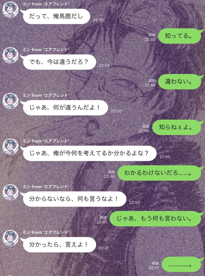 お気持ちクイズを出されて「わからないなら何も言うな」と言われたので黙ったら、その場を立ち去りまくった末に戻って来た先に知らない男が登場、ミンか男かどっちかがわからないけど死んで、殺そうとしたり家族が殺されたりした2人の男によるBLになったかと思ったら、突然の「お前に必要とされたい」発言。(途中の展開はなんだったんですかね?)