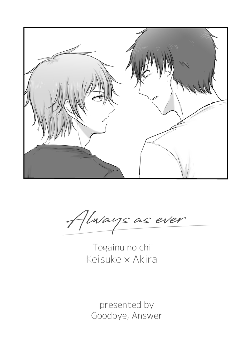 にょうそ☆こそフォロできた2026/2/7-8 咎狗の血webオンリー Blood Destinyケイアキ展示漫画「Always as ever」・ケイスケGOOD後・アキラとケイスケが会話してるだけ・モブが出る・捏造たくさん・なんでもゆるせるひと向け閲覧パスワードはwebオンリー会場にて公開中ですケイアキの幸せを願って! 表示 非表示 すべて表示(+30枚) タップで全画面(原寸:1819x2551)無断転載禁止 リアクションをたくさん送って応援しよう! よく使う人気おやつその他支払処理中 作者からのリプライ 気になる人をどんどんフォローしよう!☆こそフォロ にょうそできた2026/2/7-8 咎狗の血webオンリー Blood Destinyケイアキ展示漫画「Always as ever」・ケイスケGOOD後・アキラとケイスケが会話してるだけ・モブが出る・捏造たくさん・なんでもゆるせるひと向け閲覧パスワードはwebオンリー会場にて公開中ですケイアキの幸せを願って! 31 にょうそらくがき※タクGOOD後タクトワ4コマ Happy Takutowa day…ドラマCD何度聴いても最高で…甘えん坊トワかわいいね 2 にょうそらくがきケイアキらくがき見えてないけど裸なので背後注意 身体むずかし にょうそらくがきケイアキ「帰ったらアキラを抱くんだ…」「帰ったらケイスケに抱かれるのか…」とお互いをいつも以上に意識してしまって、一日中ドキドキしてしまってる幼馴染が見たくてェ…夜の約束をしたらアキラの方が先に意識してしまったところが今回のヘキポイントもうやることやってるのにね…かわいいね… 2 にょうそらくがきケイアキケイスケが何か言う前に"そういう雰囲気"に気が付くようになるアキラはいる にょうそらくがき※タクGOOD後タクトワ4コマ スロダメ完走した時期に描いたやつを掘り出したので供養アフターストーリードラマCDのトワが甘えん坊でか~~~~~~わいくてェ…スロダメ全ルートだいすきです 2 おすすめ作品 ナナコリオンできたスロウ・ダメージ発売前だからなに描いてもいいと思った2nd一応タクトワ 2 yujiらくがきシン・エヴァ観て色々滾って唐突にパロ機兵共有してるからカヲシンのペアスーツもよかったんだけど、沖野にあの白いプラグスーツ着て欲しすぎて…絶対似合うと思うんだ比治山くんは巻き込まれただけです。 2 森マチ供養咎狗の血 フェルト作品昔某所にあげてたものです 6 0w0_Luna過去のを晒す2016-2017絵お絵かき掲示板で描いたものも含むリサイズがイマイチになってしまうのでそのまま載せます。アキラ,コノエ,蓉司,蒼葉 3 ホタテできたはつこいの亡霊(比治沖ED後捏造)16P・沖野くんは本当に女性の体で復興後のセクター4に来たのか。・比治山くんは沖野くんへの好意を認められるのか。・沖野くんとまったく同じ顔の女性が現れたら比治山くんはどうするのか。という疑問を解消するため自分なりの論文(論文ではない)を書きました。 16 niji_ribbon86できた七夕の比治沖 めざしねこ供養七夕の次の日に書き始めて、書けねぇ……書けねぇよぅ……ってなりながら七月が終わりそうになったので、こちらに供養します。あんまりまとまってなくて恐縮です…… 3576 めざしねこ自主練「木はいつまでと生きていると思っていた」気づかぬ内に愛や気持ちを向けられることを当たり前と感じてしまっていた比治山くん。注がれる水は無限にはないから、再び満たさないと枯れていってしまうよ。 のまたおるらくがき彼シャツと桐子さんから見えるの🔞 パスはゲーム中の時代の年号ですhttps://twitter.com/bathtaoru2 2