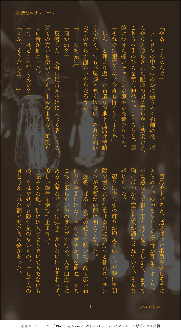 seki☆quiet followMAIKING夜な夜な不思議な地下通路を巡るひぜなんの話※書きかけの冒頭部分のみ少しずつ書いているものの、思ったような流れになってくれないやつ。完結させたい。 show all(+1 images) Tap to full screen (size:618x1132).Repost is prohibited Let's send reactions! freqpopularsnackothersPayment processing Replies from the creator Follow creator you care about!☆quiet follow sekiMOURNINGひぜなん&すいまろ※途中で終わっています※ギャグ&何でも許せる人向け 1809 sekiMOURNING休憩時間に暇してる加州くんがたまたま来た肥前くんとお茶して駄弁る話、または肥前くんの絶望は加州くんの希望という話。 ※CPなし※刀時代に折れていることに触れています(刀剣男士としての破壊描写はありません)※独自解釈を多量に含んでいます 3234 sekiDONE『平日の朝の話』現パロひぜなん(再掲)結婚or同棲してるひぜなんの朝の風景、ほのぼの。個人的に現パロがめちゃくちゃアツいので再掲します。 5 sekiMAIKING夜な夜な不思議な地下通路を巡るひぜなんの話※書きかけの冒頭部分のみ少しずつ書いているものの、思ったような流れになってくれないやつ。完結させたい。 2 sekiMOURNINGひぜなん『また来年も』本丸の花火大会の話。去年の書きかけが勿体なかったので少し直してアップしました。※南海先生&肥前くんの軽装発表前に考えた話です 1982 sekiDONEひぜなん『赤い花の独白』肥前くんがひたすら悩む話※ささやかですが性的なシーンがあるので一応年齢制限つけました 3613 recommended works ymzknlDOODLEMysterious Blue Love letters 24 あそうぎ/可能性の獣INFO3/16のHARUコミ申し込みました~取り急ぎでサークルカットは前のになってますが差し替え間にあうといいな… lonecosmDOODLEㅂㅉ 2 ロメオDONEタグ企画 相川渦波課題提出の関係でプレミアム会員に一時的に登録したのでAI学習阻害処置を施してみました(ポーズはアプリ内搭載トレス素材を使いました) アルトMOURNINGシリアスなひまごちゃんとはご様のお話お粗末語彙力です!!! 3554 TRPGhuiyonboDOODLEえぐい……………………………………………ほんまによかった…………… おなそら 現行/未通過❌ ねいさんDOODLEログイン ミルカサキPASTヨノラ私服リクエスト 3 nashi_na123DOODLEレプ葬げんみ×曲パロ 2