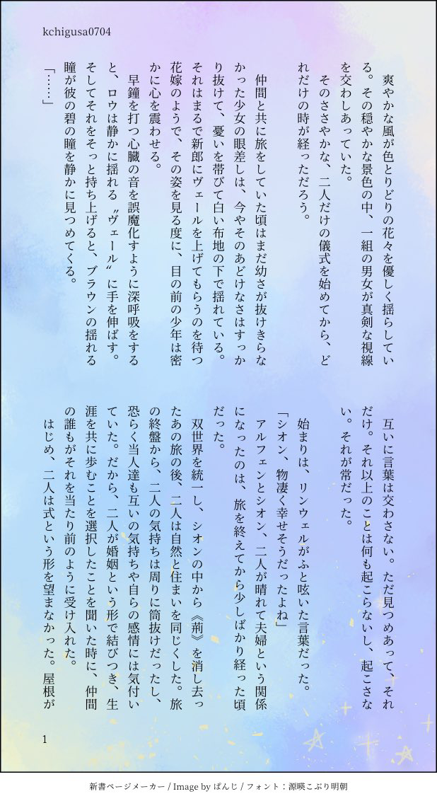 元ネタは友人が言った、「ロウリンには丘の上の花畑とかで結婚式ごっこしてて欲しい。それでも照れるリンウェルちゃんに、笑ってるけど、慣れてきた頃に「そろそろ本番するか」って言ってガチで迫ってきて欲しさあるな」という言葉です。