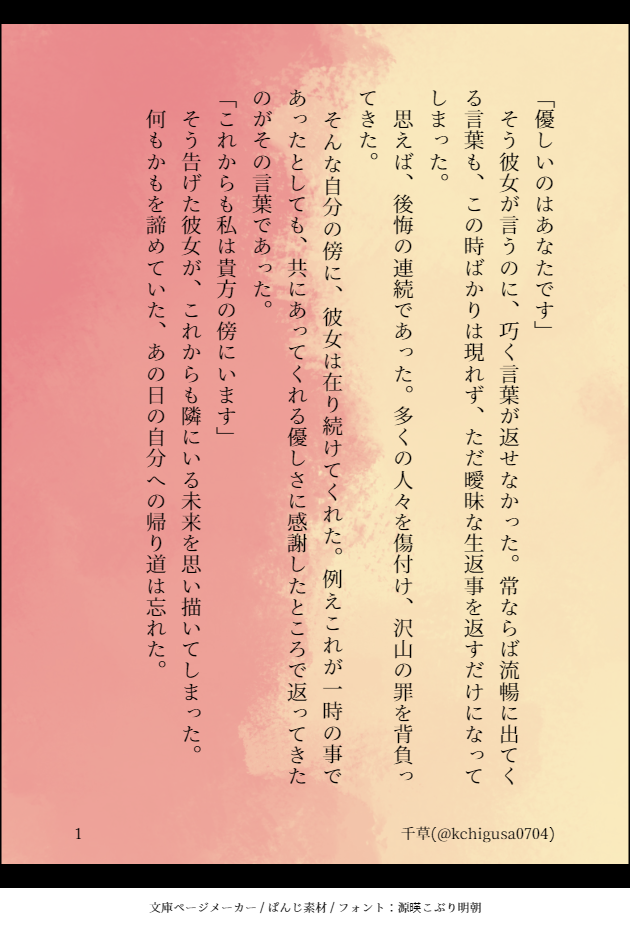 ちぐさ☆quiet followDOODLEテュオキサ診断メーカー(https://shindanmaker.com/801664)より、千草さんには「優しいのはあなたです」で始まり、「帰り道は忘れた」で終わる物語を書いて欲しいです。できれば2ツイート(280字程度)でお願いします。を元に書きました。 Tap to full screen (size:630x928).Repost is prohibited Let's send reactions! freqpopularsnackothersPayment processing Replies from the creator Follow creator you care about!☆quiet follow ちぐさDOODLE※※※R-18作品です※※※※※※未成年の方の閲覧はご遠慮ください※※※以前に書いた『分け合う罪』の加筆修正版。「媚薬を10本飲むまで出られない部屋」に入ってしまった二人の話。めちゃくちゃ書き途中です。※カガリ優位というか攻めっぽい?雰囲気も若干あります(ぬるめ)パスワードはエメナイ会場に載せています。 14 ちぐさDOODLE2025/7/13 星に願いを 2025 -day2- 明日のかがり火と共に 星願2025 新刊②🔞パート ちぐさDOODLEアスカガワンドロに参加させていただいたもの。お題【桜】 4 ちぐさDOODLEついったに上げてたやつ 貧乏性なのであっちにもこっちにもらくがきカガリリフレインアトリウム(SideM)聴きながら描いてた ちぐさDOODLE以前に書いた『夢の中であなたと』の加筆修正版。夢の中で”カガリ”について考えるアスランのお話。ちょっと暗めトーンですが最後はハッピーエンドです!※ちょっとモブ出ます※パスワードはエメナイ会場に載せてます。 9 ちぐさDOODLEアスカガ/「もちろん結婚式でも泣きましたが?」診断メーカーより。千草さんには「大人は泣かないものだと思っていた」で始まり、「ああ、もうやってらんない」で終わる物語を書いて欲しいです。できれば3ツイート(420字)以上でお願いします。https://shindanmaker.com/801664 3