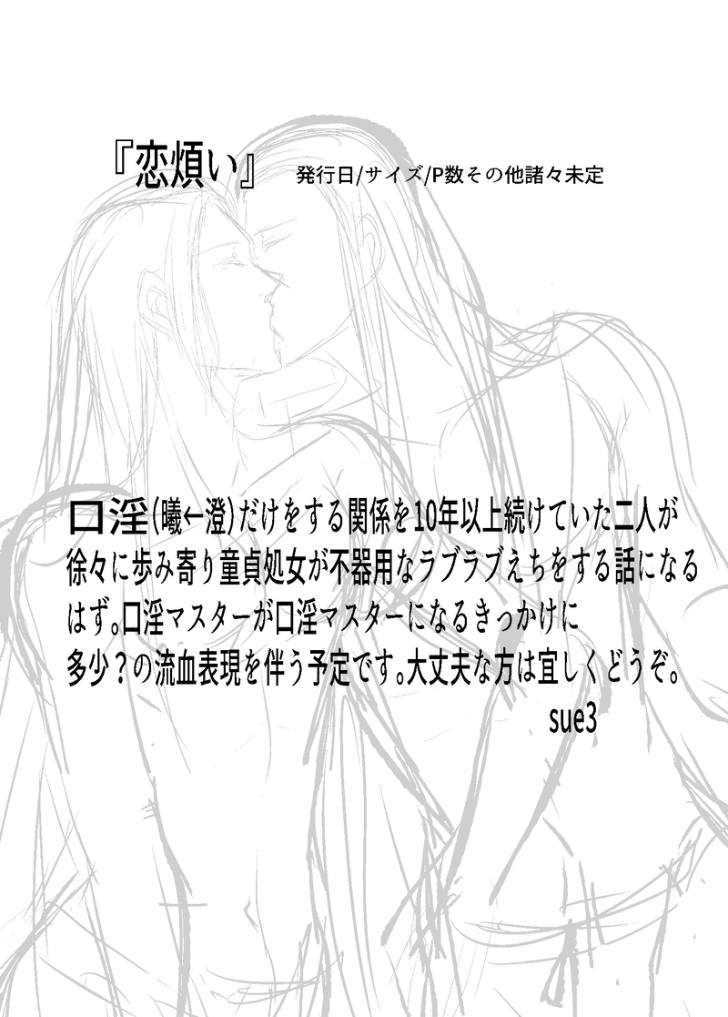sue3_sue2☆quiet followPROGRESS『恋煩iい』進捗です。1月の曦澄イベント時にある程度形になってればいいなあ。でも、この前にも先にも続くのでガンガン直しが入りそう。とりあえず早くスケベが描きたい #曦澄 #恋煩い① show all(+10 images) Tap to full screen (size:1455x2032).Repost is prohibited Let's send reactions! freqpopularsnackothersPayment processing Replies from the creator Follow creator you care about!☆quiet follow sue3_sue2DOODLE龍×猫魈の交尾は激しく逢って欲しい練習。(※やってない)もっと野性味出したいんだけど( ´艸`) sue3_sue2PROGRESS『恋煩iい』進捗です。1月の曦澄イベント時にある程度形になってればいいなあ。でも、この前にも先にも続くのでガンガン直しが入りそう。とりあえず早くスケベが描きたい 11 sue3_sue2DOODLE医療AU少しだけ肌色らくがき。本当に落書きでしかない!!! 2 sue3_sue2DONE曦澄プチペーパーラリー漫画お題『婚姻の儀』一応ネップリ登録したんですがやっぱり余白が気になったのでこちらにアップします。 4 related works sue3_sue2PROGRESS『恋煩iい』進捗です。1月の曦澄イベント時にある程度形になってればいいなあ。でも、この前にも先にも続くのでガンガン直しが入りそう。とりあえず早くスケベが描きたい 11 recommended works 風谷春永DOODLE主喜多 tamayura830DONEおいとく sgmDONE猫の日の曦澄。ひょんなことからイマジナリー(霊力)猫耳と尻尾が生えて猫になった江澄。何かとご都合。他作リアクションありがとうございます!! 3340 いまそDONE勧酒本編後にくっつく曦澄のなれそめ話です。捏造満載!漢詩を題材にしています。 14 いまそDONE夢で会いましょう②ショタ曦、お芋掘りからの一緒にお風呂編です!!⚠️晩吟が歌います !笑🤗(中国民謡の"茉莉花"の歌詞を引用しています) 9 takami180PROGRESSたぶん長編になる曦澄その4兄上、川に浸けられる 2784 takami180PROGRESS長編曦澄11兄上やらかしの全貌(重要なネタバレを含みます) 1527 yomogi_ktDOODLE藍曦臣が愛を囁くはなし。作中の熱烈な古い恋歌は、「上邪」という漢詩です。 4 アンリPROGRESSフォロワーさん100人突破記念に作業進捗を…! 2655