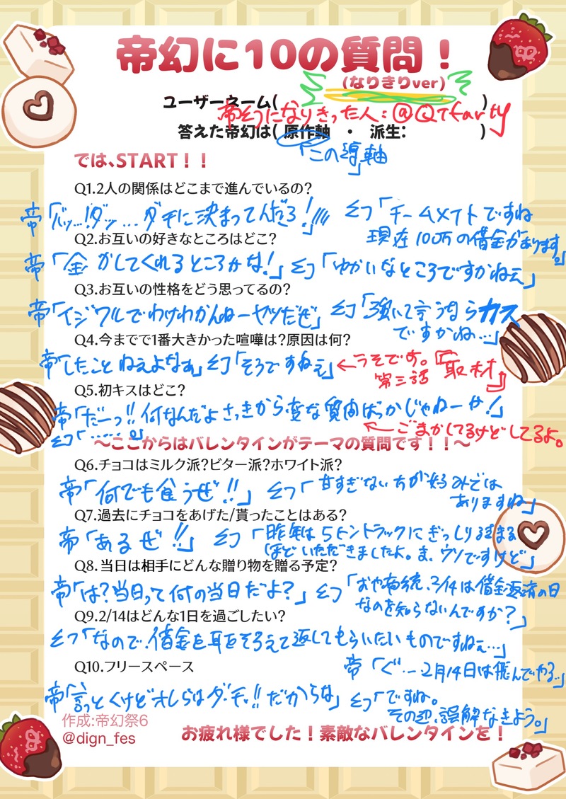 きゅーてぃーふぁーてぃー☆quiet followMEMO帝幻祭6事前企画テンプレート埋めさせていただきました。一枚目は帝幻なりきり、二枚目は「この導」世界線の創造主が描きました。三枚目は友達に送った帝幻ぬいらぶらぶショット(※偶然の産物です)字汚くてごめん。でもゴリラだから許してね。これでも丁寧に書こうと頑張ったよ。お借りしたテンプレート↓https://dignwin2.booth.pm/items/4347982 #帝幻 imperialFantasy ##帝幻 show all(+2 images) Tap to full screen (size:1990x2810).Repost is prohibited Let's send reactions! freqpopularsnackothersPayment processing Replies from the creator Follow creator you care about!☆quiet follow きゅーてぃーふぁーてぃーPROGRESS3/19日新刊用書き下ろし進捗。帝幻がらむぴにワンクッションしてもらわなきゃいけないことするそうです。多分。 4 きゅーてぃーふぁーてぃーMEMO帝幻祭6事前企画テンプレート埋めさせていただきました。一枚目は帝幻なりきり、二枚目は「この導」世界線の創造主が描きました。三枚目は友達に送った帝幻ぬいらぶらぶショット(※偶然の産物です)字汚くてごめん。でもゴリラだから許してね。これでも丁寧に書こうと頑張ったよ。お借りしたテンプレート↓https://dignwin2.booth.pm/items/4347982 3 きゅーてぃーふぁーてぃーPROGRESS今描いてる帝幻本表紙絵の線画✒️一枚目:帝幻の顔のアップ二枚目:2023年度自分史上最もプリッとしている帝統のおちり 2 きゅーてぃーふぁーてぃーDOODLEオオサカ8thライブ2日目!iwskさんの水色のヤシとフラミンゴのジャケットかわいい。オレンジのラインとネクタイが滅茶苦茶いい感じでささら。(※手描き文字汚くてごめん!! 日本語ムズカシ…🥺練習中です) きゅーてぃーふぁーてぃーPROGRESS帝幻 足なめ12月に出したい新刊より女王様受けと奴隷攻め(≒下剋上)がQTの帝幻観の一要素なんで、足なめって発想に至ったんですよね。 きゅーてぃーふぁーてぃーDONEこっちの配信で描きました。リクエストいただいた夜職の🎲です。ストリップダンサーです。 https://m.youtube.com/watch?v=nKAUDVncjEE related works yuzukichi5DONE帝幻フェス無配。現在付き合ってる帝幻。幻太郎が過去に一雨と体の関係があった設定です。軽い事後シーンあり。 8 ramugendaiDOODLER18の帝幻ラクガキ、描きたいとこだけですパスワード18才(高卒)以上ですか? 4 304_microDOODLE #帝幻 #ヒプマイ yu_mg000DONE【サマフェス展示漫画】付き合ってる帝幻(玩具使用表現あり)※高校生以下の閲覧禁止 6 真夜中のすいか🍉MAIKING長編予定の話の一章部分(全17ページ予定)出来た分だけ随時追加中。付き合ってないけどなんか拗れてる帝幻🎲📚書くとネタバレになるので具体的には言えませんが、色々注意です…。▼最終更新●3/11 17ページまで追加(一章完成しました!) 17 きちきちばんばんDOODLE猫だいげん ぺらしPAST10分漫画シリーズ帝幻さん「絵がほんとにきたない」 8 きちきちばんばんDOODLE盗賊の顔隠してる布外して、お前めっちゃくちゃキレーだな!って屈託無く笑ってくれ…()Stella王様×盗賊 帝幻 R_mmarblecDONEさまふぇす2用無配。開催おめでとうございます! 7