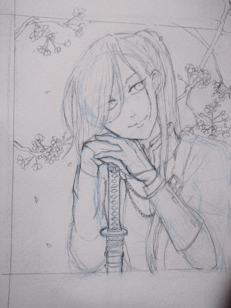 凄く雑なんですが、桜色青江のラフ、ペン入れ、色塗り後の流れ。ちゃんと写真撮れば良かったです。