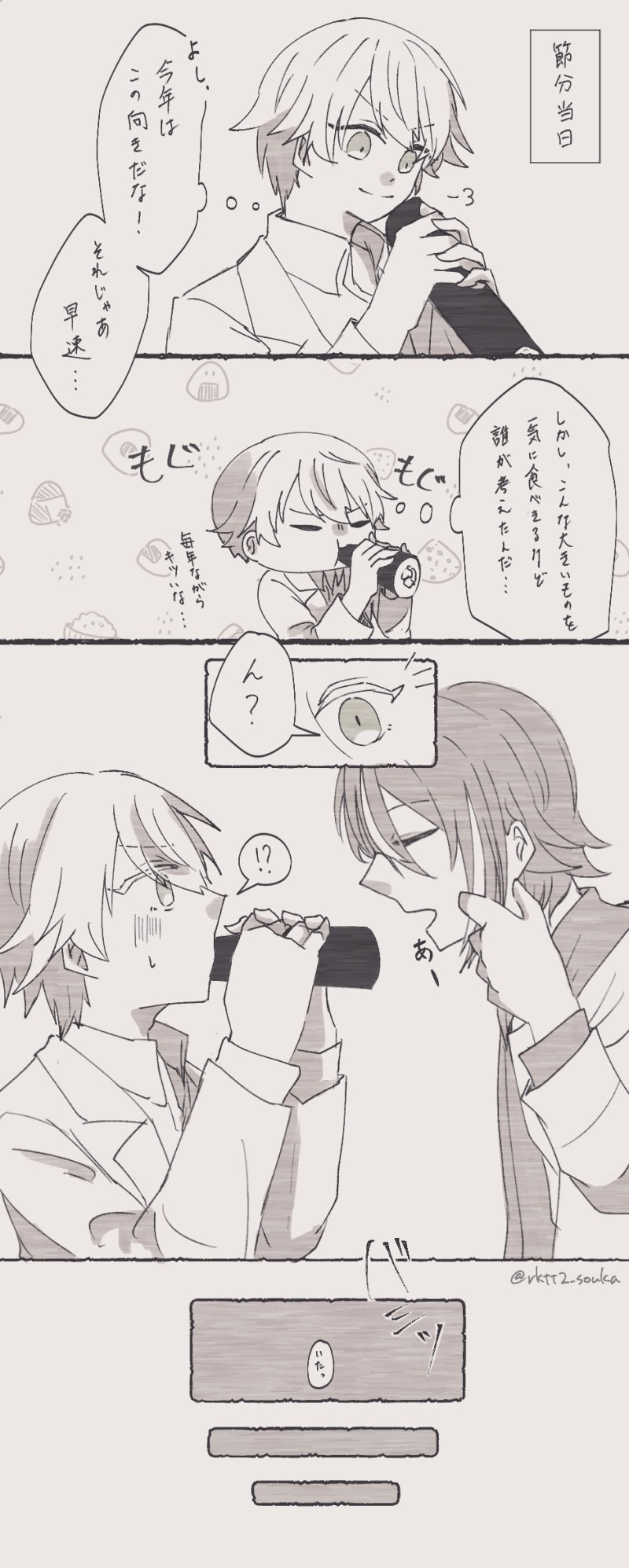 そうか☆quiet followDOODLE※腐向け(類司)るいつかワンドロのお題である『節分』をお借りしました!るいつか可愛いね………愛おしいね……… #類司 RuiKasa ##PRSK show all(+1 images) Tap to full screen (size:939x2342).Repost is prohibited Let's send reactions! freqpopularsnackothersPayment processing Replies from the creator Follow creator you care about!☆quiet follow そうかMOURNING人力用に描いたものたち 3 そうかDOODLE※NDRV3 腐(王最)※映画パロ風ありあいぱよくんを買ったのでそれの練習 5 そうかMOURNING※NDRV3 腐(王最)0706にお~さい絵チャを開催したのでそこで描いたもの皆の麗しいお~さい見られたし素敵な線画塗れたし合作もできたし、大満足でした😊 5 そうかDOODLE絵チャ含むらくがき久しぶりにわたがしを食べました。 3 そうかTRAINING救われた内の一人原稿の描き方を友人から教わったのでそれの練習でした。赤松楓に救われたのは、最原だけじゃないんだよなぁ…。 2 そうかDOODLE※NDRV3 腐(王最)通話中に単語のお題を出してもらった落書き「猫」と「リボン」 2 related works ちゃづDONE描いたやつその1※茨あん、ジュンあん 17 ちゃづDONE描いたやつその1※茨あん、ジュンあん 17 ココノカSPOILER幻覚なので全くネタバレではないけど1072話の発言ネタ nnnnnnoodderaDONE【腐向け】チャバが酔ってハ崎さんに甘えてる漫画。ハ崎さんがトイレに行くのを我慢していたりする。 4 2watoyoDOODLE【朝のボールペン落書き】【日楠♀】【先天性女体化】日高先輩×男装後輩サキュバス家系楠ちゃん。海編。本当に気にしてるのは。 わたさくDOODLE きくちゃんDOODLEサタン様犬好きかと思いきやロクサーンみたいなパターンもあるのでやっぱ人外思考なのかな~ べこDOODLEピンク色のバレンタインなヨウグズ🍫 きくちゃんDOODLEサタン様犬好きかと思いきやロクサーンみたいなパターンもあるのでやっぱ人外思考なのかな~ recommended works canned_rosePAST本音。#創作 #オリジナル しよくらあとDONE かて子DONE neikikiMEMO少し前にキャラメイクしてた時の。 3 おうかPAST 凛華🌸PROGRESSいい感じに闇っぽくなってきた のりDONEアイコン用看板娘 ピヨピヨぴっぴDOODLE おこめPAST年越しのテレビ番組を見ながら描いていたもの。全員別々の小説の主役たちです。1作品しか完結していないのにもう9月半ばだなぁ……。