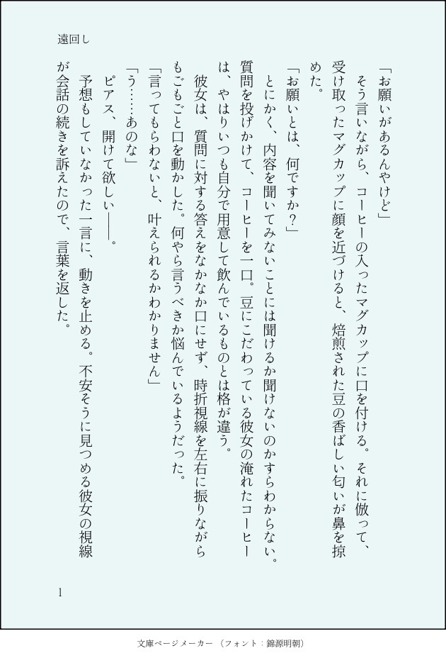 4321p_p_key☆quiet followMOURNING友達以上恋人未満なオモチリ show all(+3 images) Tap to full screen (size:630x928).Repost is prohibited Let's send reactions! freqpopularsnackothersPayment processing Replies from the creator Follow creator you care about!☆quiet follow 4321p_p_keyMOURNING新刊2章「メタモルフォーゼ」後半部分の削除シーンを締切後に書きました。このシーン絶対入れたい……って思っていたのに締切がやばすぎて入れることができず断念してしまいました。気に入っていただけるようでしたら、こっそり補完していただけると幸いです。ここまで読んでいただき、ありがとうございました。 14 4321p_p_keyMOURNINGチャレ!29ありがとうございました。新刊楽しんでいただけていたら幸いです!pass:新刊の話の中に出てくるカクテルに使う果物の名前を英語で+あとがきの行数を並べて記入ください。 6 4321p_p_keyTRAININGシンプル・100のお題(http://aria.saiin.net/~tenkaisei/questions/t100_01.html)より「笑顔が見たくて」 4 4321p_p_keyTRAININGシンプル・100のお題(http://aria.saiin.net/~tenkaisei/index.html)より「君の名前」 6 4321p_p_keyMOURNING一度は付き合って振られたけど想いを捨てきれないcちゃん。暗いです。 4 4321p_p_keyMOURNING前にネップリで公開していたバレンタインのオモチ 7 recommended works No0a11111commission phobosXdeimos 人棍哦 しゅーくりむDONE猫の日。2.22。己の欲望に従い描いた。 9 screamwandererPROGRESS ボーダー猫ジャッキーDOODLE「チ。」バデーニED横顔イラスト。 2 くにむらDOODLEおフェ向上心のあるきよぴ pass安清刀帳4桁 _Delta_o0DOODLE천재 연성러 경구(@KIMJEL_OTAKU_2) 님께 받은 디자이어ㅠㅠ내 자캐가 급격하게 잘생겨졌다. 다들 빨리 이 천재분께 커미션 넣으러 가세요. suyasuyaaaa_chDONEオクバデ/現パロ前世のことを覚えているオクジー君と覚えていないバデーニさんのお話です。(20ページ ※あとがきを含みます) 20 DOKIRAINDOODLE C.(しー)DONE10周年で復帰してからの推し刀