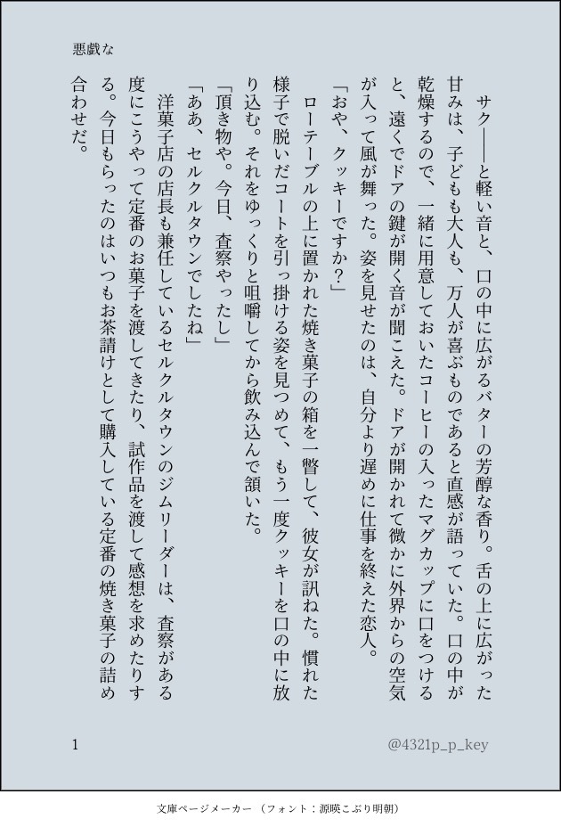 4321p_p_key☆quiet followMOURNINGオモチ show all(+3 images) Tap to full screen (size:630x928).Repost is prohibited Let's send reactions! freqpopularsnackothersPayment processing Replies from the creator Follow creator you care about!☆quiet follow 4321p_p_keyMOURNING新刊2章「メタモルフォーゼ」後半部分の削除シーンを締切後に書きました。このシーン絶対入れたい……って思っていたのに締切がやばすぎて入れることができず断念してしまいました。気に入っていただけるようでしたら、こっそり補完していただけると幸いです。ここまで読んでいただき、ありがとうございました。 14 4321p_p_keyMOURNINGチャレ!29ありがとうございました。新刊楽しんでいただけていたら幸いです!pass:新刊の話の中に出てくるカクテルに使う果物の名前を英語で+あとがきの行数を並べて記入ください。 6 4321p_p_keyTRAININGシンプル・100のお題(http://aria.saiin.net/~tenkaisei/questions/t100_01.html)より「笑顔が見たくて」 4 4321p_p_keyTRAININGシンプル・100のお題(http://aria.saiin.net/~tenkaisei/index.html)より「君の名前」 6 4321p_p_keyMOURNING一度は付き合って振られたけど想いを捨てきれないcちゃん。暗いです。 4 4321p_p_keyMOURNING前にネップリで公開していたバレンタインのオモチ 7