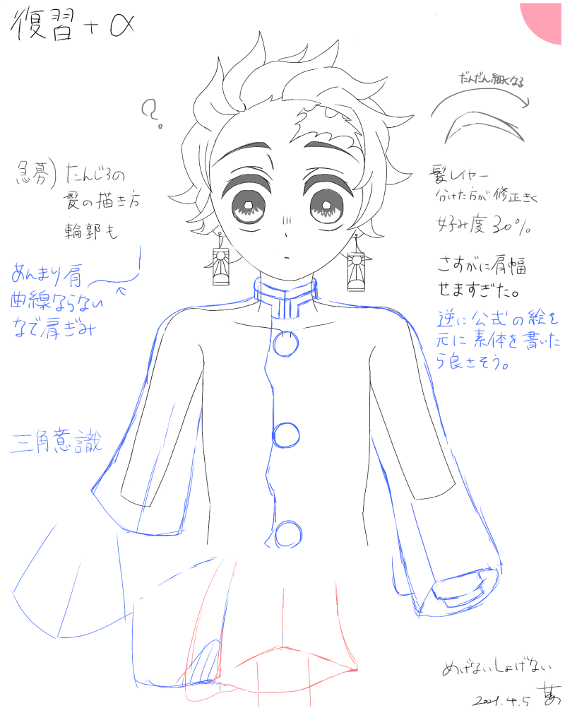 昨日の復習ついでに炭治郎の髪の練習と初のドローイングをやってみました。枚数少ないけど、これでも講座を見る時間も含めて午後丸々費やしています。30秒ドロも2分ドロに気づいたらなってるし慣れが必要ですね。