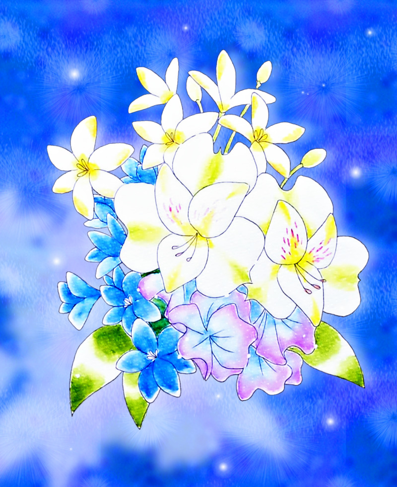 オリキャラの鬼や花、魚や風景絵など雑多に描いています。
