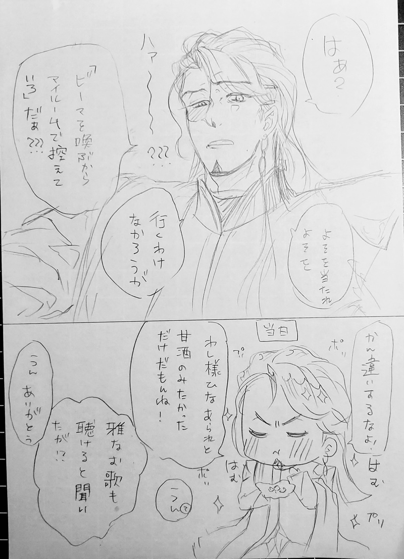 ラフ、ペンいれ、色❌、白黒、加工、腕逆気が付き描き直し、なんとか完成
