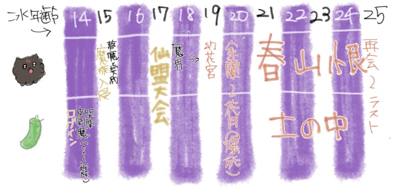 黄色い文字が年齢が書いてあったイベント、オレンジ色が何年後、何年間といった発言から予想したイベントになります。
