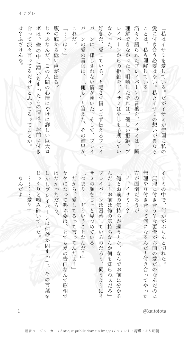 海東いおた☆quiet followDONEイサブレ。途中でよく分からなくなったけど多分(中略)誰も知らない二人だけの安らぎを得るようなイサブレが見たくてって話 ##イサブレ #SS show all(+1 images) Tap to full screen (size:618x1132).Repost is prohibited Let's send reactions! freqpopularsnackothersPayment processing Replies from the creator Follow creator you care about!☆quiet follow 海東いおたDONEイサブレ。ブレ自我≠スミ2m小型機体 4 海東いおたDONEONEエアセンR18、オ゙ボ♡喘ぎあり、Not恋愛関係、主従関係のみ、生えてる×生えてない書きたいところだけ書いたので導入から一気に話が飛びます🔐 18↑ y/n? 2891 海東いおたCAN’T MAKEONEメガスタ 書きかけ恋とか愛とかないけどスタスクのビジュは存外気に入ってるメガ様がスタスクが傷つけられたことにイラつく感じのやつが書きたい 808 海東いおたDONEイサブレR18。ブレ自我≠スミ24.8.31~9.1開催イサブレWebオンリー『I♡BraveBonfire -Chapter01-』展示作本編後のようなそうでないような謎時空で人間大のブバといちゃらぶするイサブレ🔐 18↑ y/n? 3609 海東いおたDONEイサブレR18。自我ブレ≠スミ。温泉その後。※んお゙ッ♡系喘ぎあります前→https://poipiku.com/2195157/10172104.html🔐 18↑ y/n? 2 海東いおたDONEイサブレ。自我ブレ≠スミ。2mブレと温泉次→https://poipiku.com/2195157/10173383.html related works fttnnDONEひなたぼっこする嶺藍(2018/3/30) fttnnDONE寝起きの嶺藍(2018/3/30) ecseilogPASTわがまま弟くんとおやすみ後の秘め事 https://twitter.com/eclucifer/status/983064063293796358 3 asmDONE「獅子は狼に先制する」すけべなディミレスSS。ディミトリがユーリスに嫉妬する話。煤闇ではなく青獅子本編なので、大きなネタバレはありませんがユーリスのプロフィールに関する記述があります。 7 haikyoIzu0207DOODLEmmntrの灰が赤部長に怪しい薬を盛るだけのほのぼのを書きました。2022年9月11日の動画(🦕プレゼンツ)を参考資料にしています。 風守雷矛DOODLEウェーーーイwwww(吐血)※バレンタインネタ20/2/17 yuakanegumoDONE恋人ヴィク勇❄⛸こっそりと隠れて、なぜか楽しそうにスマホを眺めるようになった勇利くんに不安を覚えたがヴィクトル、最終には圧倒的にhappyになるおはなし😇🌸ヴィ「ケータイ見せて?」 1890 as_kikucho_lovTRAINING【R18】金時と士郎がひさしぶりにえっちしてるだけ※少しだけ濁点喘ぎ※結腸責め未満(経験有り) 5 月(ユエ)DOODLEゆるライで書いたもの。テーマは「風邪」ぽっせ大好きな📗が大好きです。 3
