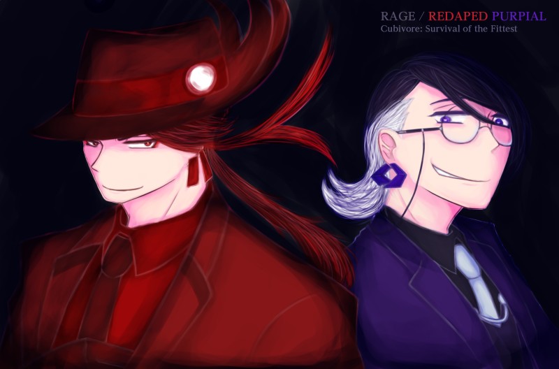 暴色の赤と紫の擬人化です。右上の英語は英語版の名前です。背景が描けなくて真っ黒にしてしまう…