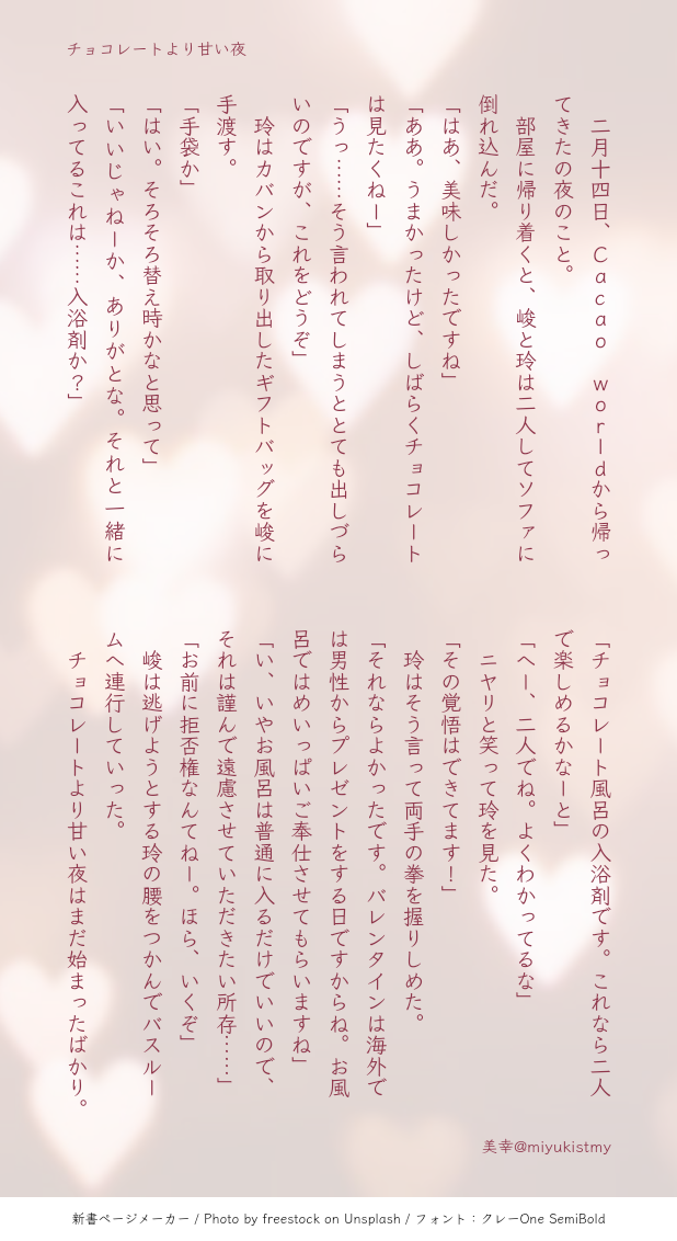 miyukistmy☆quiet followDONE【峻玲】チョコレートより甘い夜こちらもバレンタインポストのリクエスト Tap to full screen (size:618x1132).Repost is prohibited Let's send reactions! freqpopularsnackothersPayment processing Replies from the creator Follow creator you care about!☆quiet follow miyukistmyDONEエアコレ2023冬用バレンタインカード。今の香水イベ・マップストの世界線で、誰かに片思いしている玲ちゃんのお話と短歌です。 miyukistmyDONE12/25エアコレのクリスマスカードです。【菅玲】ただいま攻略中 全2pクリスマスイブの付き合っていない菅玲。2ページ目は短歌です。 2 miyukistmyDONE #聖夜一夜の過ちヒーローズ140字SS企画に参加します!一応ギリギリ大丈夫かと思いますが、念のためこちらでワンクッション置きます。【耀玲】です。 miyukistmyDONEエアコレ2022 in Summer暑中見舞い企画作品。【司玲】「はじめてはあなたと」出張で離れ離れの司玲が電話しているお話です。 2 miyukistmyDONEstmyサンド企画参加作品俺の心の声を聞け【マトリ玲】 8 miyukistmyDONEエアコレお題《春》配布・交換会【清玲】あなたの愛に酔う(全2p)新堂さんの誕生日に藤の花を見に行った清玲のお話です。 2 recommended works うめ@眠いDOODLE #スタマイ 2 mnm_0010_kiDOODLE #スタマイ春くん 小夜の倉庫DONE「温もりが欲しくて」(九玲)/2018.2.8 5 小夜の倉庫DONE「Eat me」(耀玲)/2018.2.5フォロワーさんのイラストのイメージで書いた初めての耀玲。 3 hino_stmyDONE服部さんお誕生日SS 3 hino_stmyDONE京介くんお誕生日SS僕に夢中なキミと俺/京玲せっかく二人きりになれたのに、キミは画面に夢中で…… 3 姫葵MOURNING宮瀬BDで描いてたはずなのにもう四月なので供養 カヤコDONEドライブデートの帰り道。ブレーキ踏むのが上手な男は夜が上手って言うでしょ? 2 sirohumoDOODLEスタマイのseason1クリア記念にユニットキャラを描いてみようその2 朝霧さんとにかくボスに攻撃を食らわせる作戦のためチョイス。いるといないとで大きく違う!レアだって伊達じゃない!