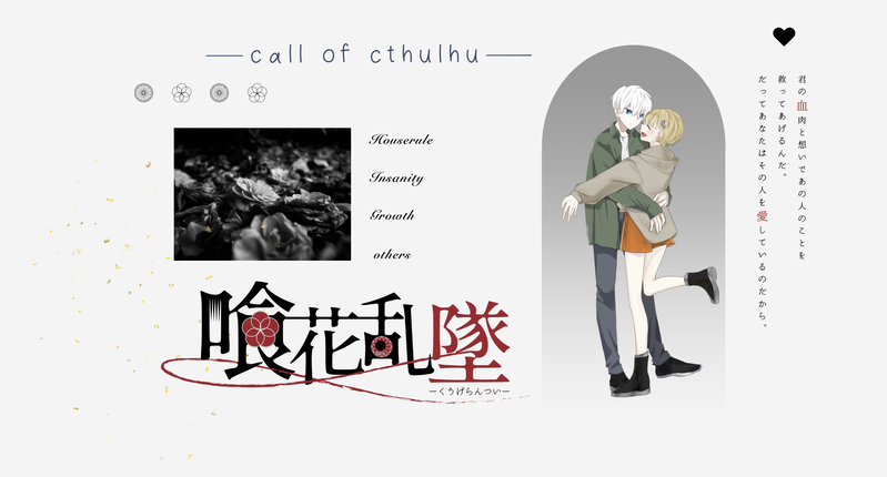 mt_pck☆quiet followDONECoC『喰花乱墜』KP⇒ぷちこ(KPC:飛鳥 響)PL⇒もくず(PC:西端 虎白)両生還にてシナリオ終了です!こはひびってかわいいいきものたちで…いいもの吸ったな。ありがとうございました! show all(+7 images) Tap to full screen (size:2244x1208).Repost is prohibited Let's send reactions! freqpopularsnackothersPayment processing Replies from the creator Follow creator you care about!☆quiet follow mt_pckDONECoC『HELLO,HUMANS!』KP⇒もくず(KPC:成井 大就)PL⇒ぷちこ(PC:古藤 李世)▽ 両生還 9 mt_pckDONECoC『トルチェ・デ・キッチュ!』KP⇒ゆこ(KPC:一 白)PL⇒さぎり(PC:天道 火輪) ⇒ぷちこ(PC:東雲 初晴) ⇒もくず(PC:香撫子)▽ 全生還 13 mt_pckDONECoC『カレー、ナンDEATHか!?』KP⇒岼(KPC:漆間 笹良)PL⇒ぷちこ(PC:迅波 鳴瀬)▽ 両生還 12 mt_pckDONECoC『あなたそれが怖いのです。』KP⇒ぷちこ(KPC:日輪)PL⇒ゆひくち(PC:椛)▽ 両生還 9 mt_pckDONECoC『ROOMCERF』KP⇒もくずPL⇒てと(PC:弥勒 市護)PL⇒ぷちこ(PC:宿里 咲藍)▽ 両生還 17 mt_pckDONECoC『わらう鬼』KP⇒たらいなHO1⇒さぎり(PC:天道 火輪)HO2⇒ぷちこ(PC:東雲 初晴)HO3⇒もくず(PC:香撫子)HO4⇒ゆこ(PC:一 白)▽ 全生還 16