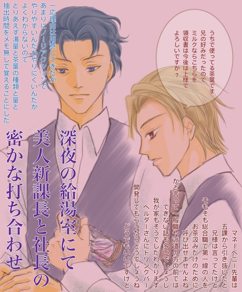 槙@maki_0☆quiet followDOODLE現パロ乙女ゲーか逆ハーロマンスだったら第二新卒でいきなり課長に採用して社宅も用意してくれる社長とか絶対あんな男(誰)忘れて彼にしときなさいよ!て言いたくなるやつ定職ついてる組の中でも高給取りだし… #憂国のモリアーティ moriarty,TheSorrowful #MtP Tap to full screen (size:1075x1299).Repost is prohibited Let's send reactions! freqpopularsnackothersPayment processing Replies from the creator Follow creator you care about!☆quiet follow 槙@maki_0DONEタイトルが出オチ。プライベッターに載せたものを微修正してこちらにも。 6924 槙@maki_0DOODLE未来を想像すること、という話 ゆもり本誌の会食後またはその合間のシャとウィの会話 数ページの雰囲気漫画になるかなとコマ割ってセリフだけ配置してったらセリフ長っ!てなって別書き千字以下のSSとしては処女作かもしれない 3 槙@maki_0DOODLE服取り違えレストレードとパターソン決して彼が巨乳なわけでもメタボなわけでもなく 槙@maki_0DOODLE現パロ乙女ゲーか逆ハーロマンスだったら第二新卒でいきなり課長に採用して社宅も用意してくれる社長とか絶対あんな男(誰)忘れて彼にしときなさいよ!て言いたくなるやつ定職ついてる組の中でも高給取りだし… 槙@maki_0DOODLEシャーロックの葬儀後にハドソンさんに紅茶勧められたマイ兄 淹れ方を教えてくれと言われて平然と対応できるのルイス君くらいでは?という妄想ルイス君は人を呼ばずに飲みたい時があるのか人手不足なのかな…くらいは思っても他人の事情にミジンコほども興味ないので、好みと淹れたい量くらいしか訊かずにさくさくお手本だけ見せる 槙@maki_0DOODLEアル兄様 髪の描き方は手癖リセットしないとだめだ related works 藍葉_MAIKING紅茶の日(11/1)ときいて思い描いたのがこの方だった。もうちょっとちゃんと色塗ったらシブにもアップしたい。 みずきDOODLEモリミュBlu-ray発売おめでとう!絵第2段。昨日よりかちょっと時間かけて描いた。#憂国のモリアーティ ヒヨリSPOILER『シャーロック・ホームズ わが人生と犯罪』の内容を踏まえた絵日記大佐とフレッド君、初描きでした…ごめんなさいこんなんで しらゆき_FADOODLEウィリアム描きました!汚くてすみません😓 みずきDOODLE #憂国のモリアーティ悪を裁く者 と 謎を暴く者 mgmDOODLE憂国/ボンド特別な青 risuonigiriDONEシャーリーとビリーできた! greentofu111DONE🔞 JohnLouis 🔞sunset make out ~ 3 みずきDOODLEモリミュ円盤発売おめでとうございます🎉#憂国のモリアーティ