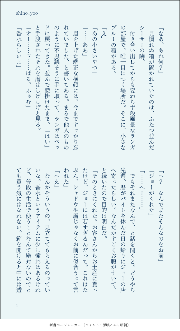 shino_yoo☆quiet followDONE香水をつけたランガにドキッとする暦の話・フレグランス発売が嬉しかったので香水ネタのラン暦❄️🌺です show all(+5 images) Tap to full screen (size:618x1132).Repost is prohibited Let's send reactions! freqpopularsnackothersPayment processing Replies from the creator Follow creator you care about!☆quiet follow shino_yooDONE未来設定同棲ラン暦❄️🌺酔っぱらい🌺に誘惑される❄️の話 8 shino_yooDONEヘアバンドを外した🌺にドキッとする❄️と、わかっちゃう🌺の話 ❄️🌺です 雨宿り中にちょっとやらしい話してる 7 shino_yooDONE香水をつけたランガにドキッとする暦の話・フレグランス発売が嬉しかったので香水ネタのラン暦❄️🌺です 6 shino_yooDONEピロートークするラン暦 6 recommended works yuzuknzaki2DONE触手7 前半ラストです☺ 後半はいつか(今年中には…)完成したらぜんぶまとめでDL販売致しますので何卒宜しくお願い致します~! 6 電子熱DOODLE おこめDOODLE📿︎︎ ♀いちくだったり、ほかの人もいたりする 12 CatheTRPGDOODLECoC「海も枯れるまで」一応現行・未通過閲覧NG。探索者お借りしました!冬至ネタ🛁🐤合言葉→y くくいみとDONEHappy Holiday! 6 mochoDONEkiisサクカの全体図です! さのみっつDONEエアコレ開催おめでとうございます!妖ノ宮過去絵とか漫画のまとめです 大方夢宮。最後の一枚はスペースに使った書下ろしです。 16 sodanocchaDONE두루님께 맡긴 케리온 커미션이 왔습니다!크리스마스 서비스까지 주셨는데 너무너무너무 귀엽고 감동임...우리애들이 연애를 하고 사랑을 한다...🥺🥺💖💖💖💖 엄마아빠사커???????두루님의 둘을 붙이고 보는 타입 입니다! 3 shogoshogo_maruINFOGODARCA 現代コンバート立ち絵できた!中身は何にも変わってないはず!!