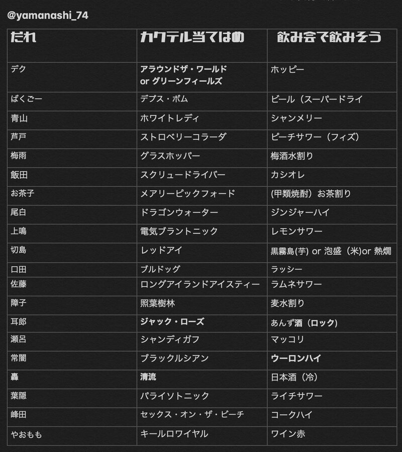 1-Aキャラの成人後妄想でお酒当てはめたらなにかな〜の